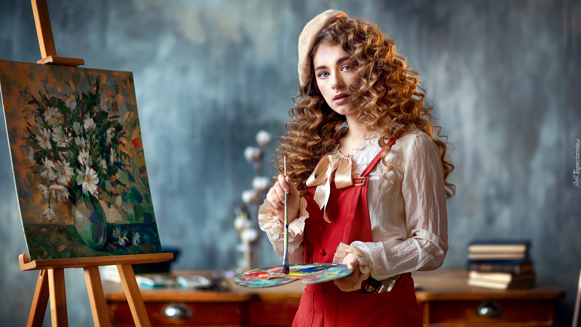 Edytor tapety: Rudowłosa malarka przed sztalugą