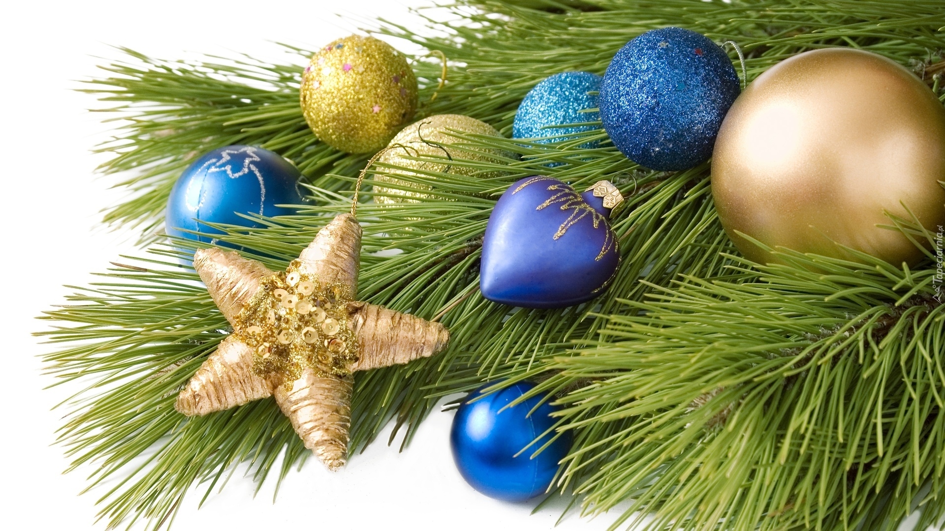 Edytor tapety: Sosnowe gałązki z niebieskimi i złotymi bombkami