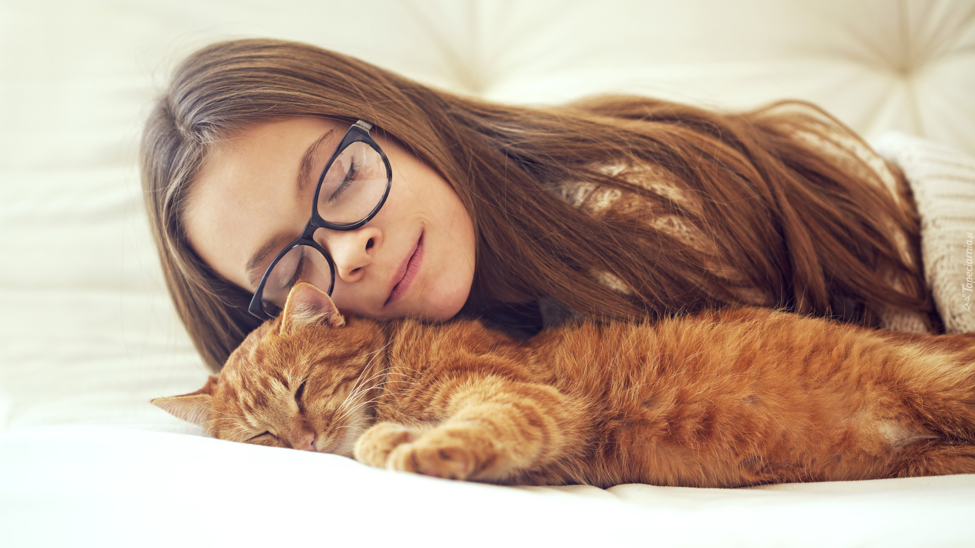 Edytor tapety: Dziewczyna w okularach i rudy kot