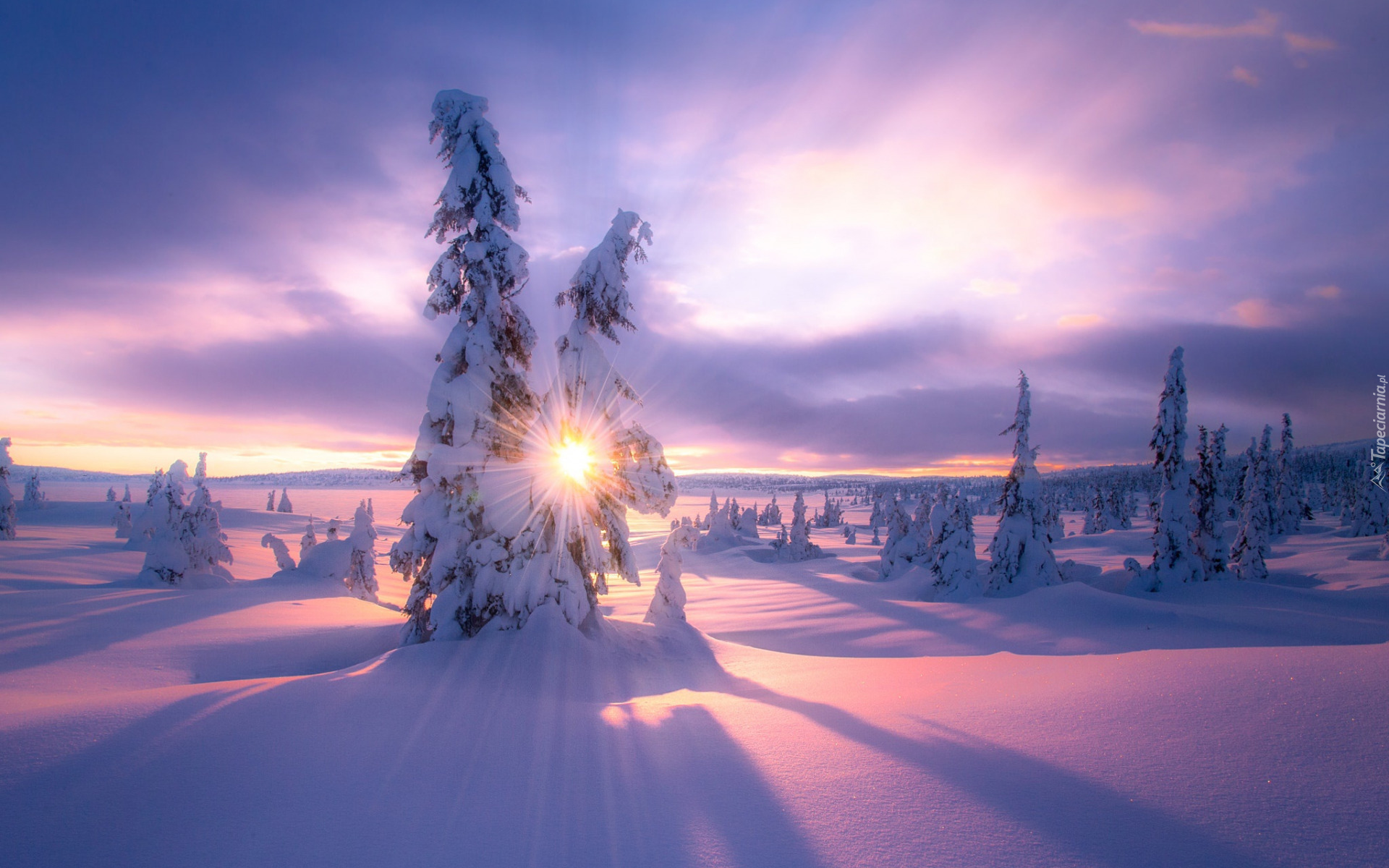 Edytor tapety: Ośnieżone drzewa i pola w promieniach wschodzącego słońca