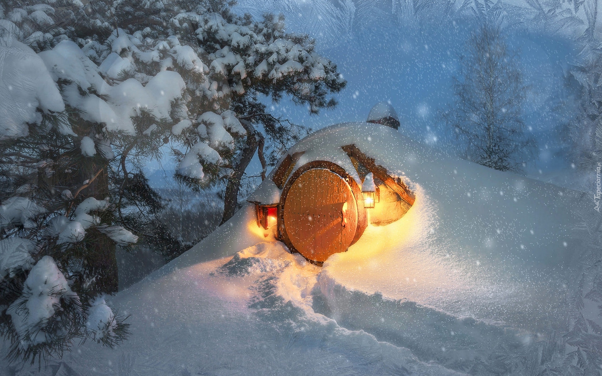 Edytor tapety: Zaśnieżony i oświetlony domek Hobbita