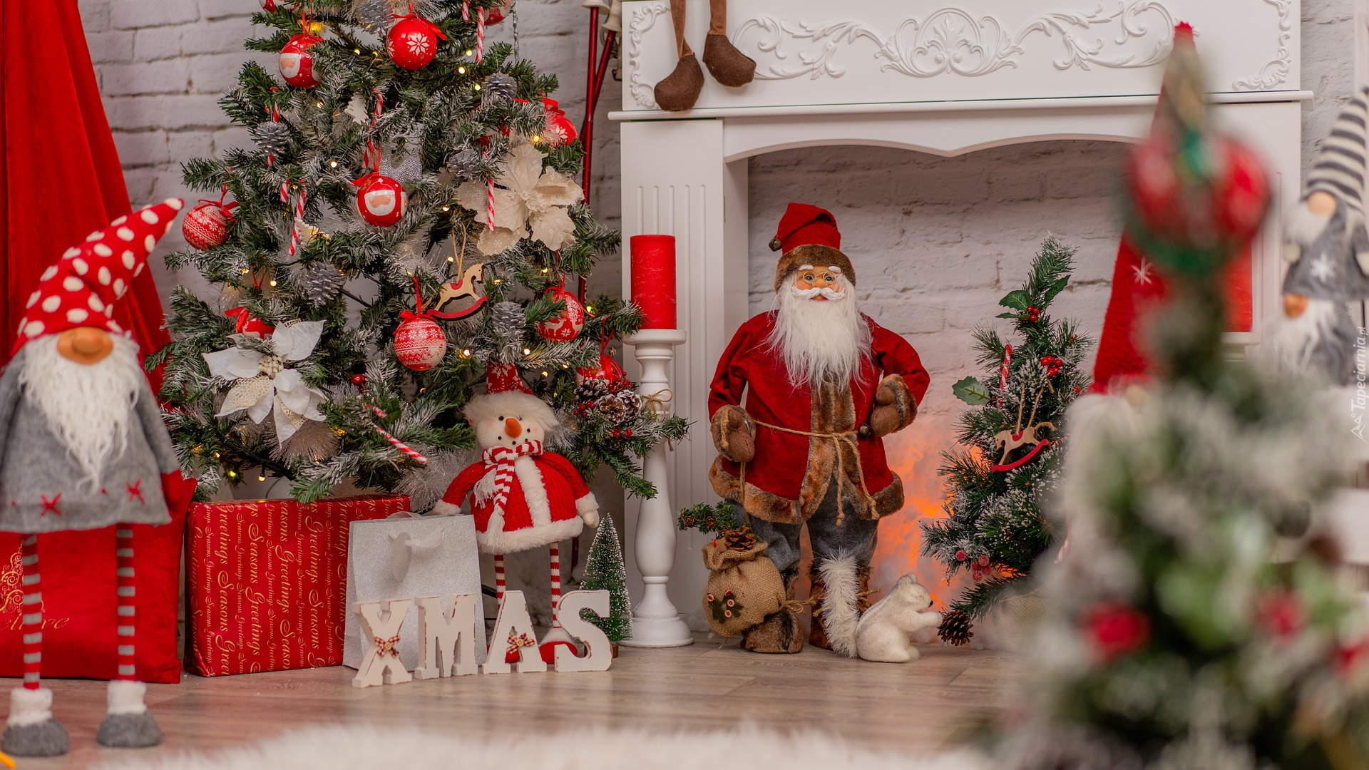 Edytor tapety: Figurki świąteczne i choinka obok kominka
