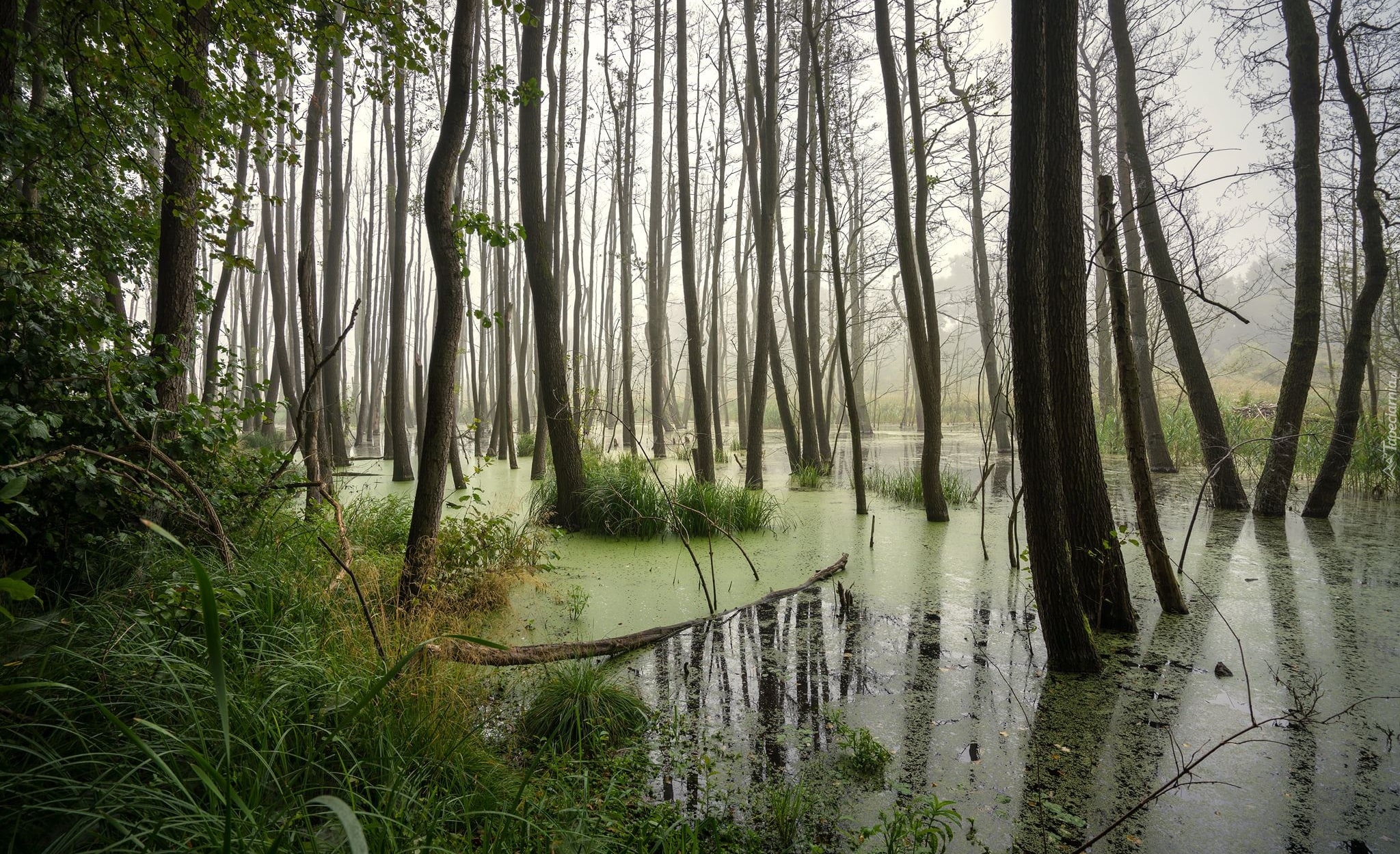 Edytor tapety: Bezlistne drzewa i trawy na bagnach