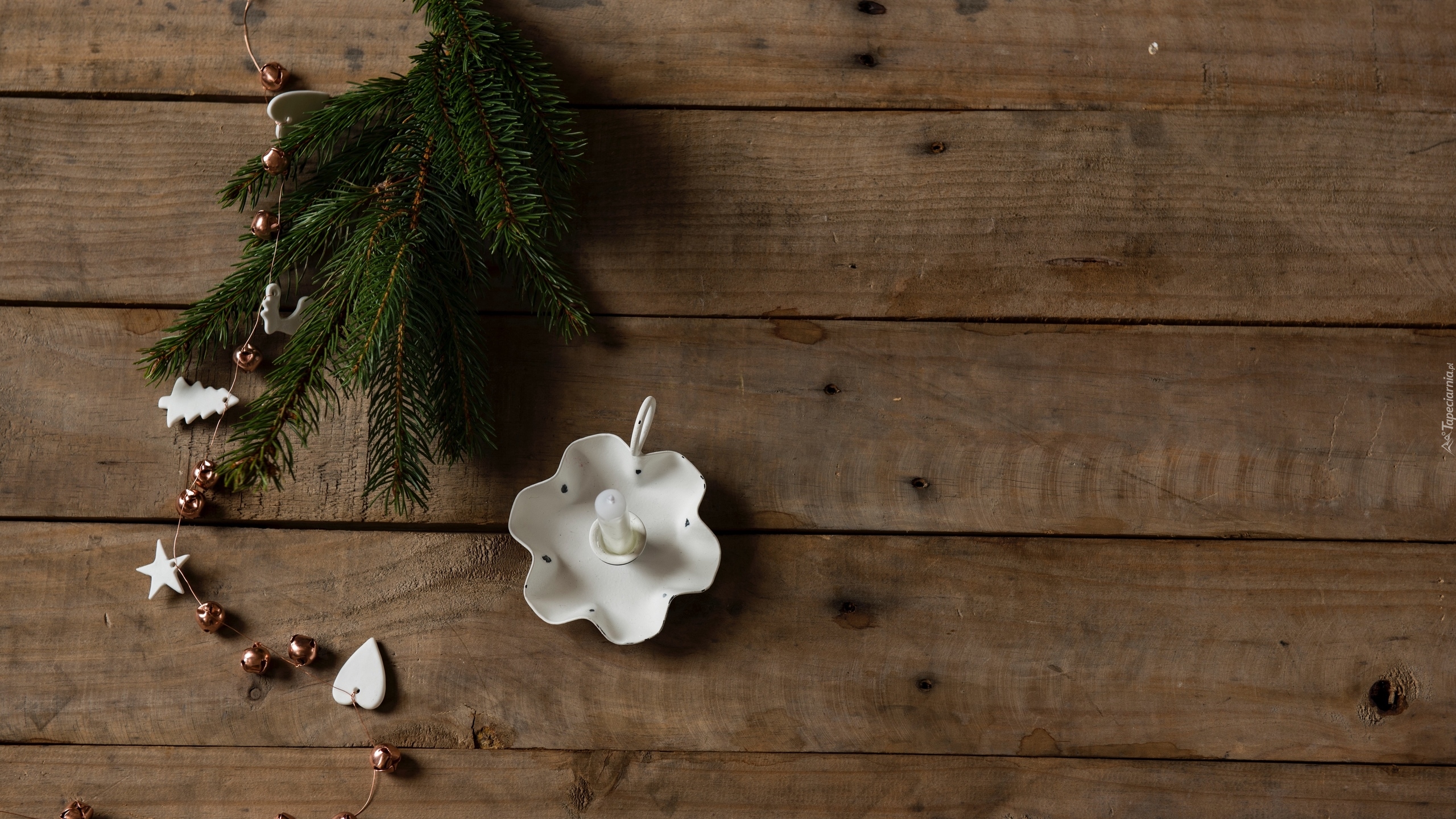 Edytor tapety: Świeca obok gałązki świerku na deskach