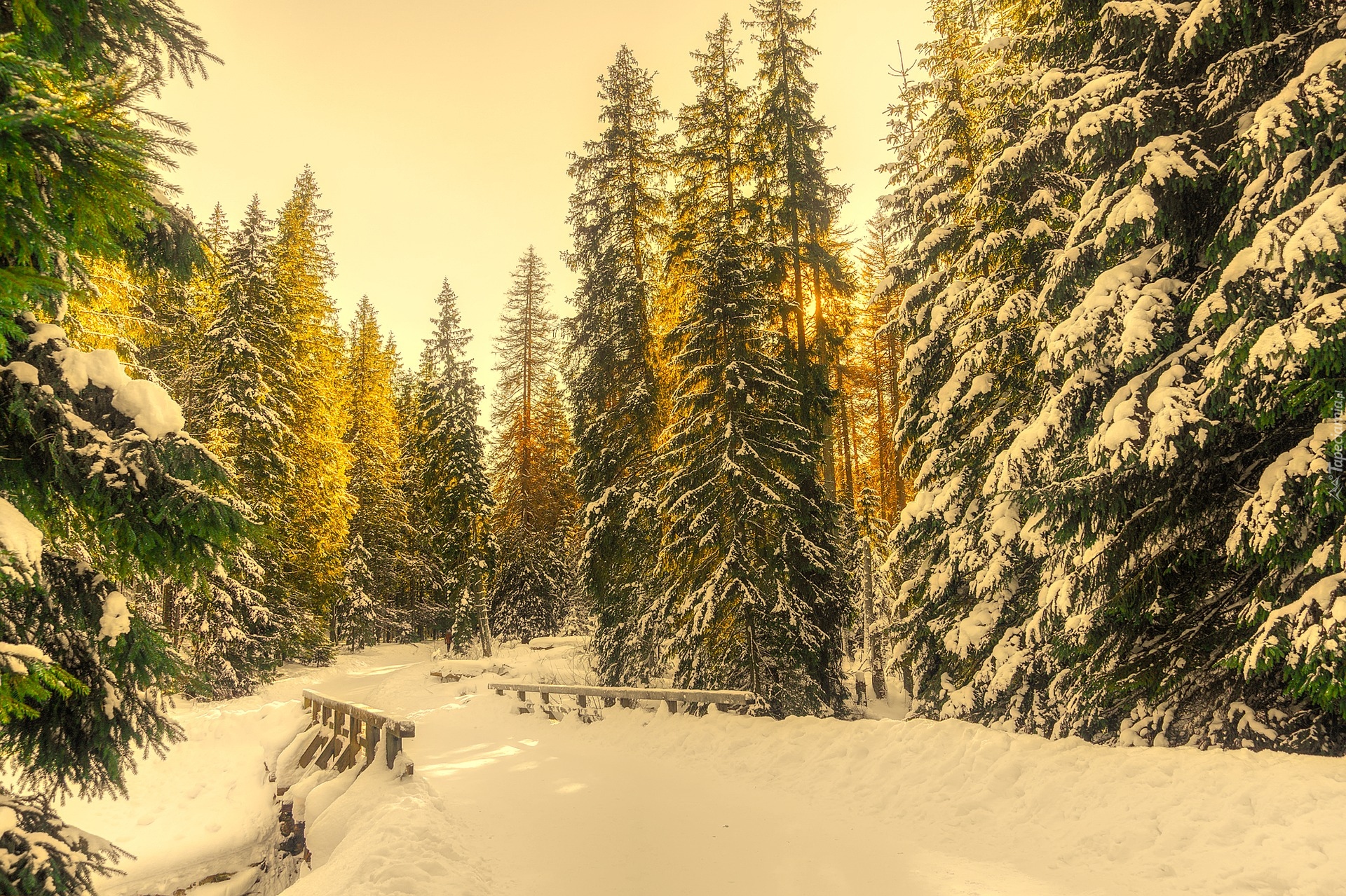 Edytor tapety: Zaśnieżony mostek i las w słonecznym blasku