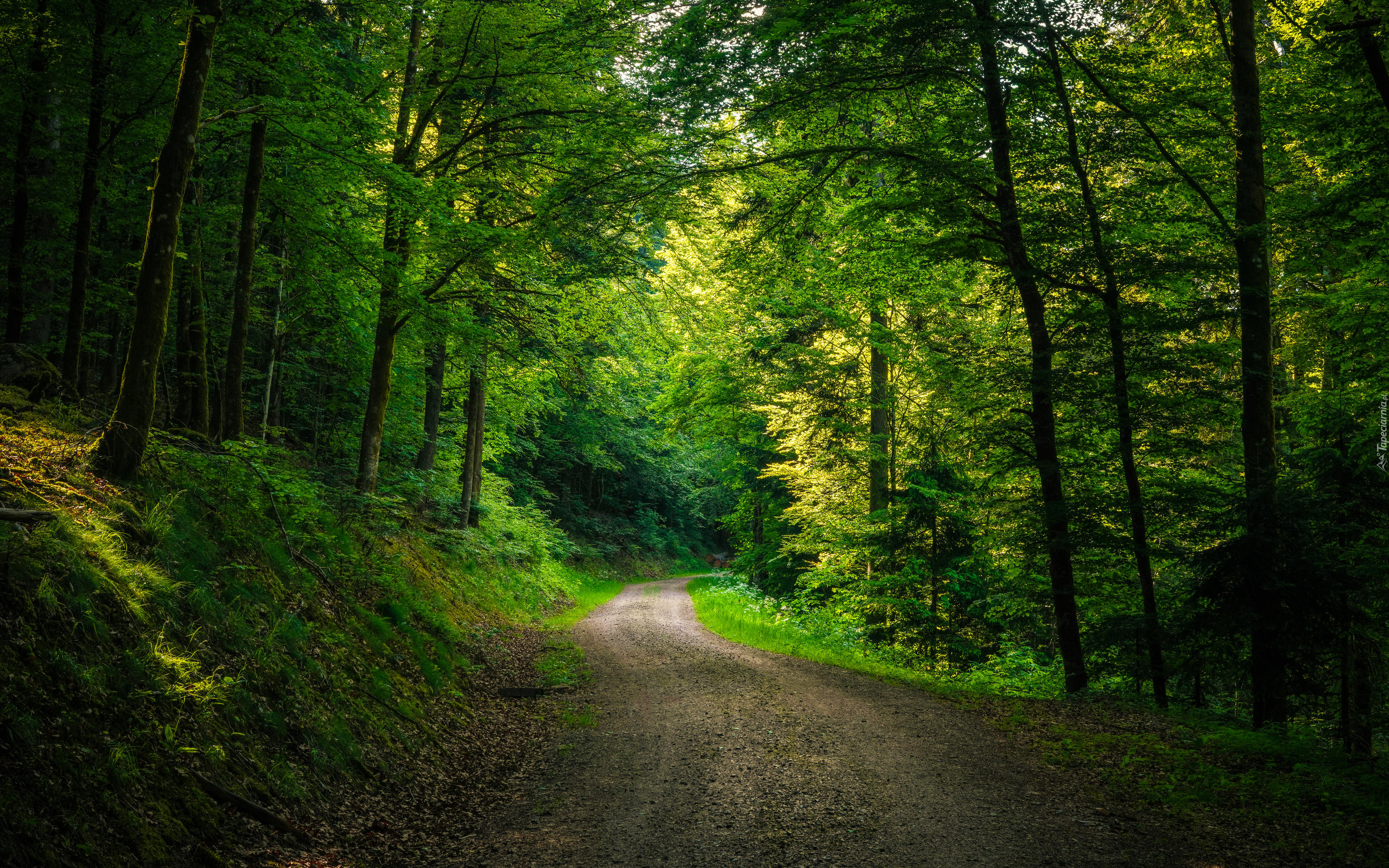 Edytor tapety: Leśna droga pośród rozświetlonych słońcem drzew