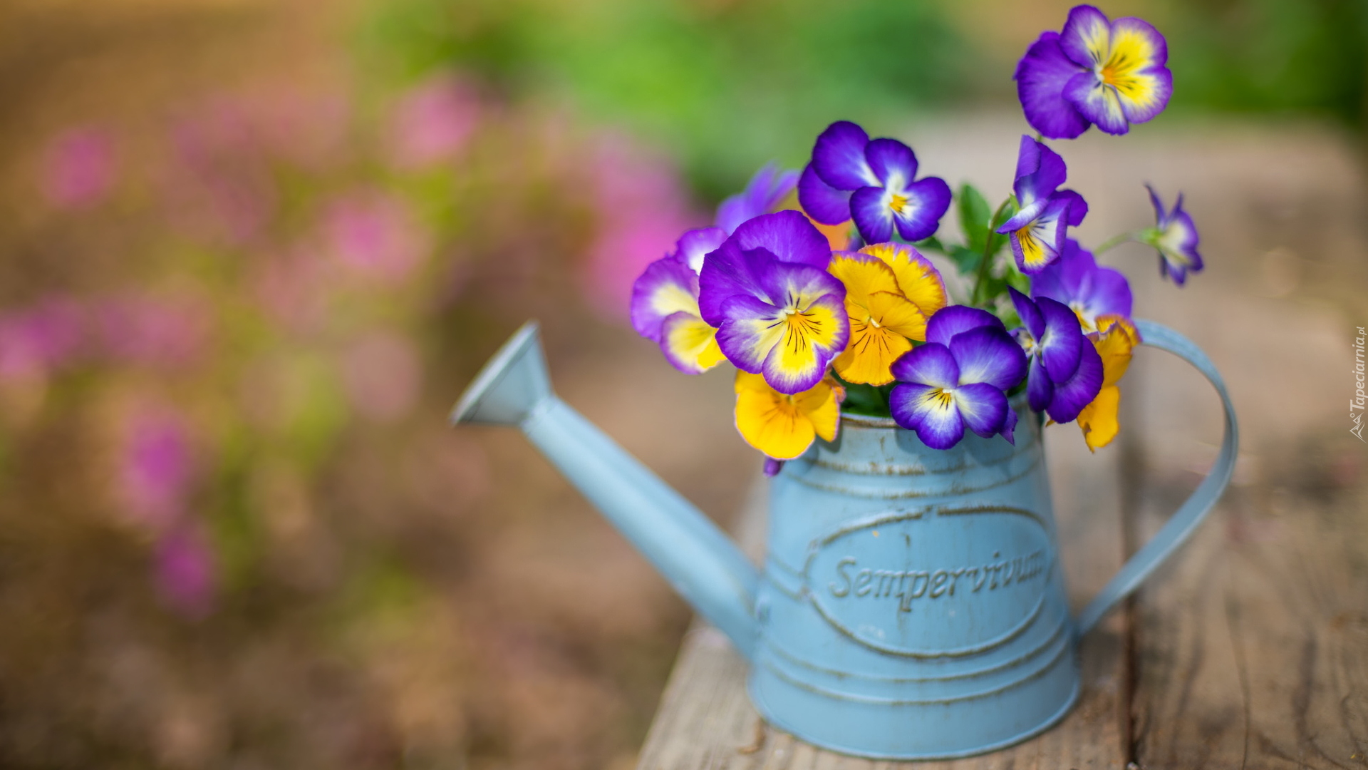 Edytor tapety: Kolorowe bratki w konewce