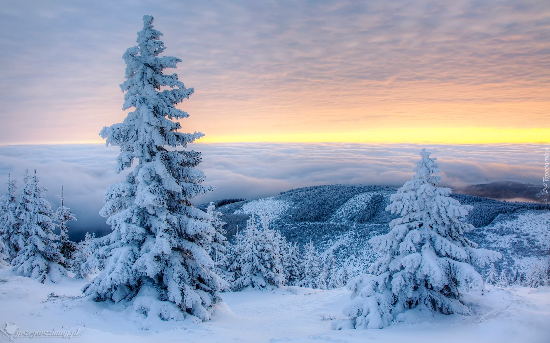 Edytor tapety: Ośnieżone świerki na tle gęstej mgły nad górami