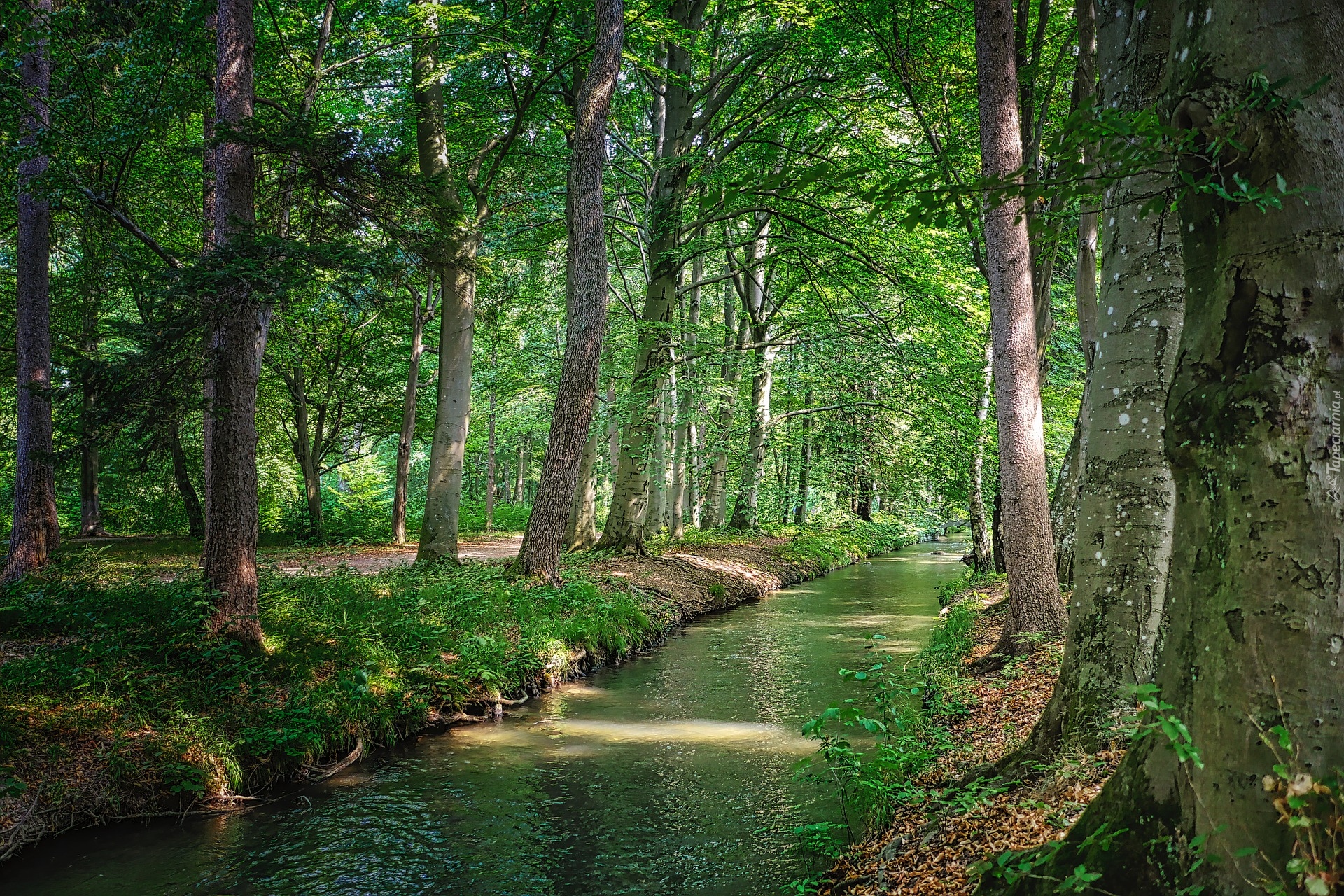 Edytor tapety: Wysokie zielone drzewa na brzegu rzeki w lesie