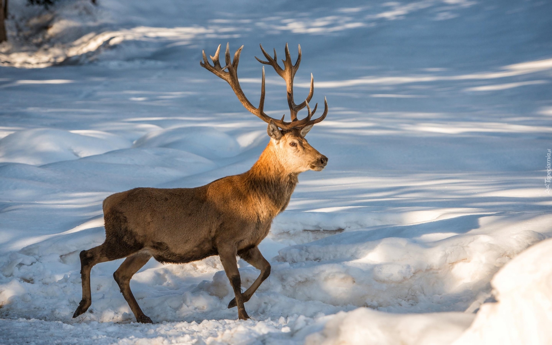 Edytor tapety: Jeleń idący po śniegu