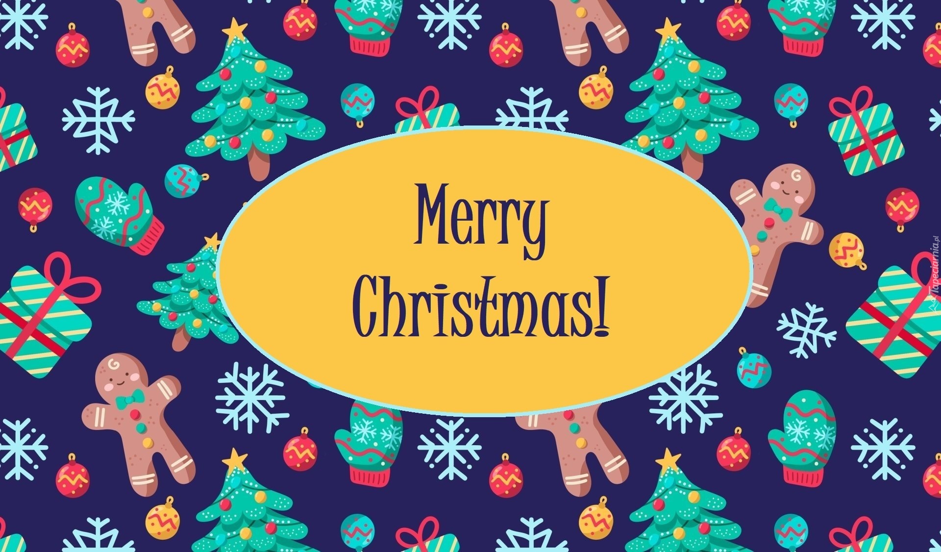 Edytor tapety: Bożonarodzeniowe życzenia z choinkami i ciasteczkami w tle