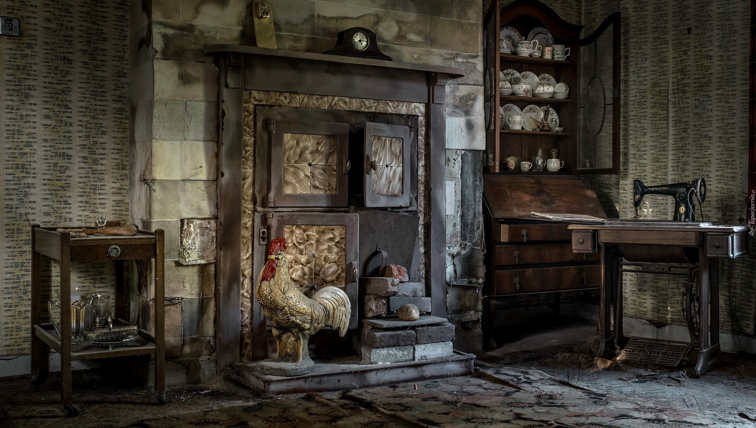 Edytor tapety: Piec i stare meble w zaniedbanym pokoju