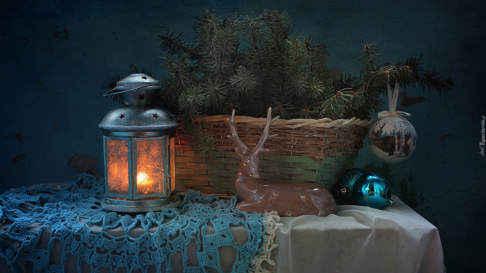 Edytor tapety: Lampion obok koszyka z gałązkami i figurki jelonka