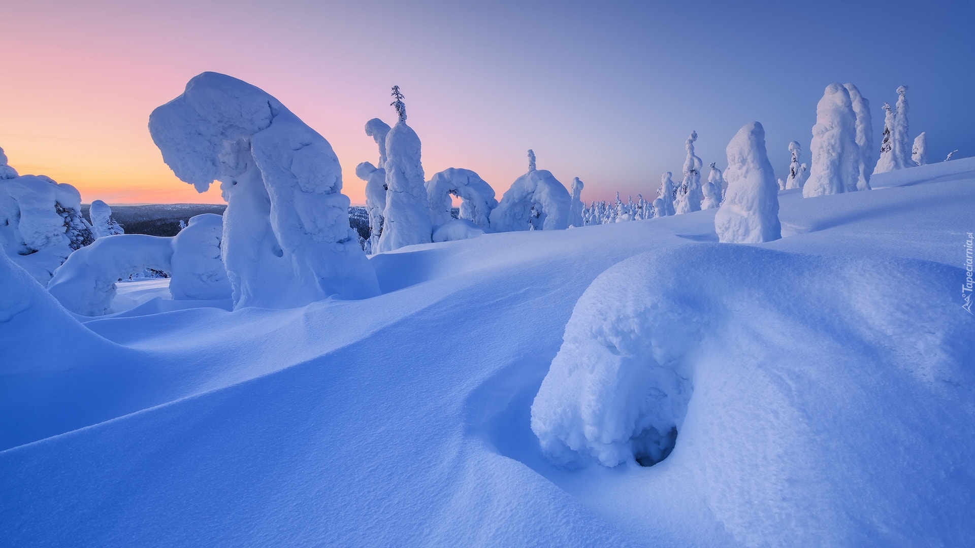 Edytor tapety: Ośnieżone drzewa w śnieżnych zaspach o wschodzie słońca