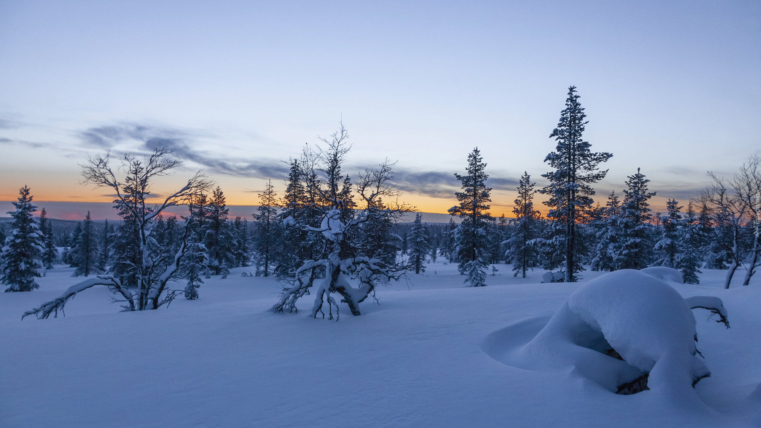Edytor tapety: Drzewa w zaspach na tle zachodu słońca