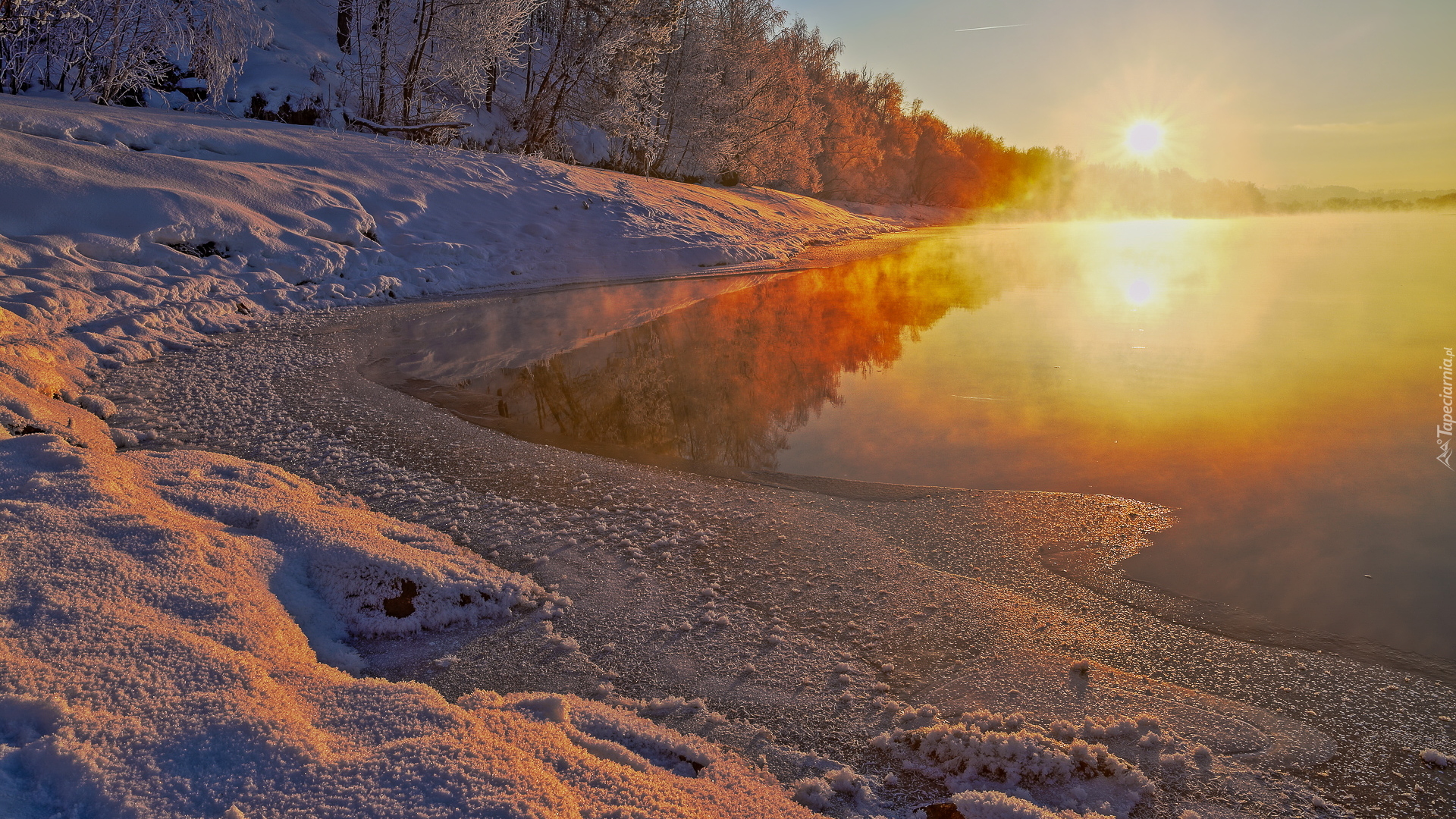 Edytor tapety: Ośnieżony brzeg jeziora w blasku słońca