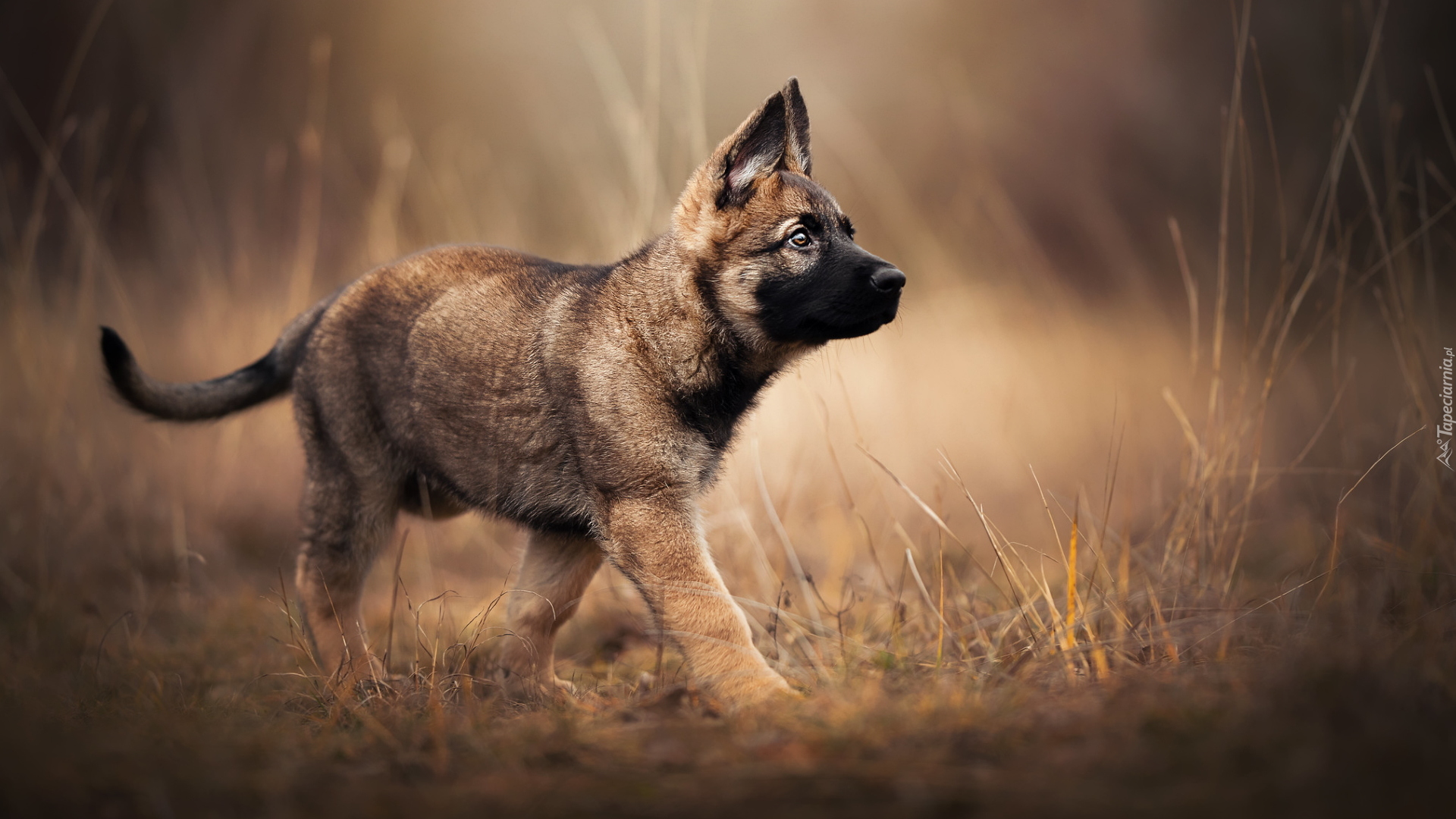 Edytor tapety: Szczeniak owczarka belgijskiego Malinois na pożółkłej trawie