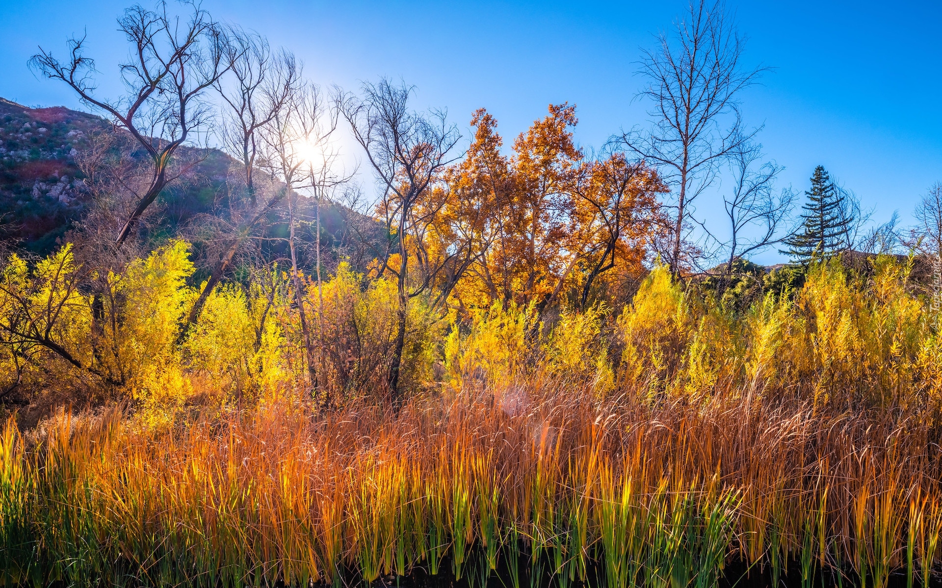 Edytor tapety: Jesienne trawy i drzewa w promieniach słońca