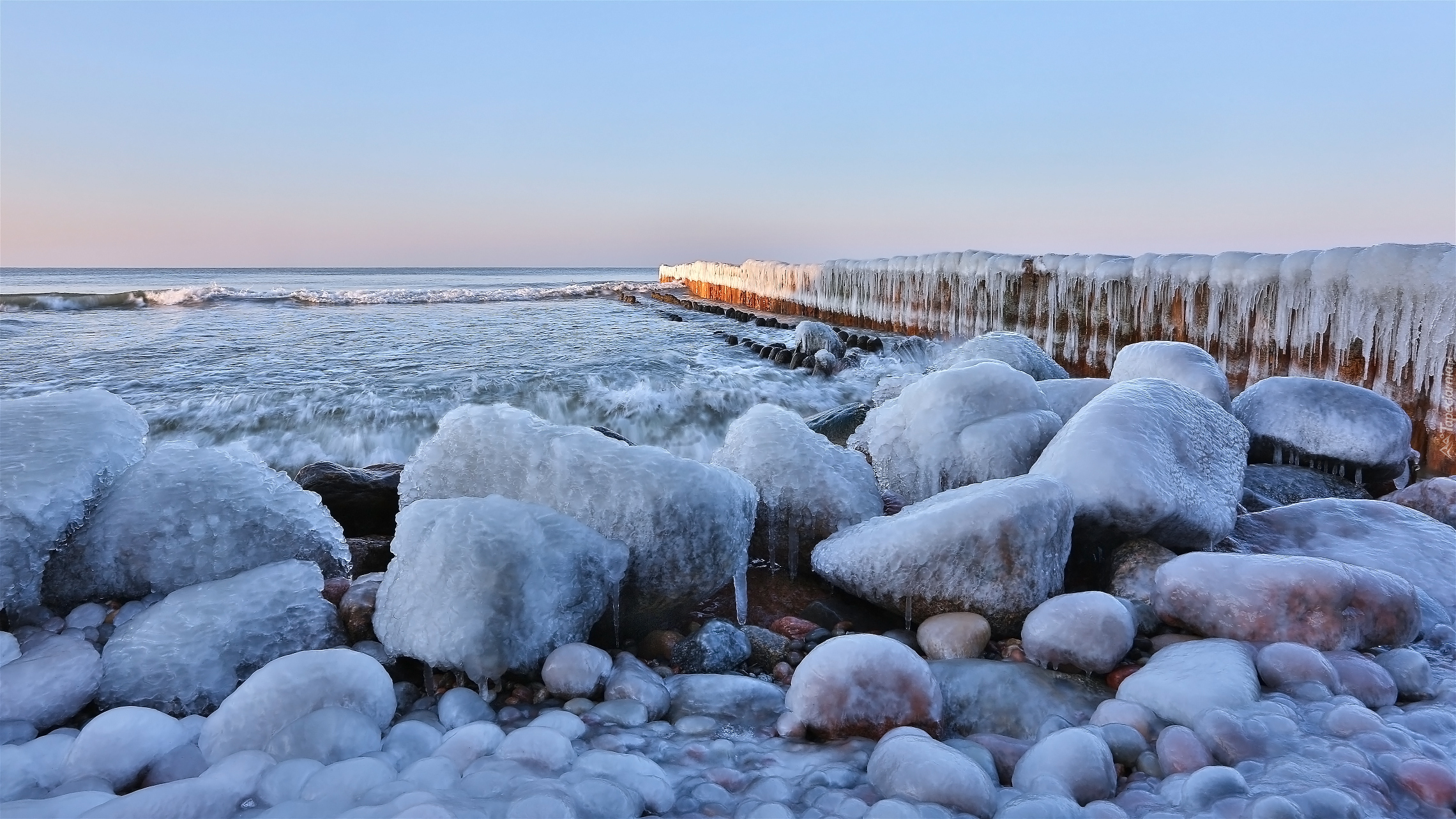 Edytor tapety: Oblodzone kamienie i falochron przy brzegu morza