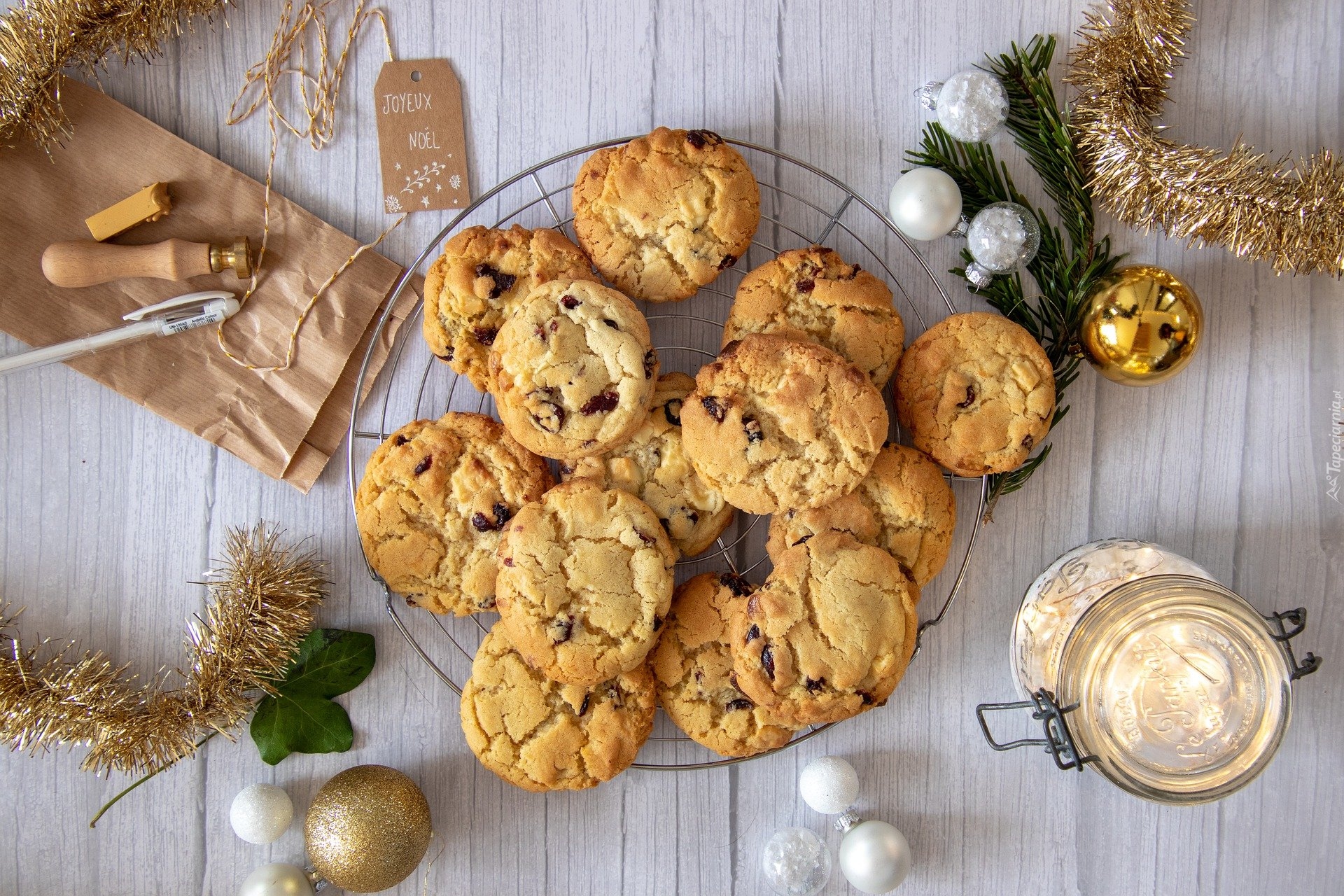 Edytor tapety: Świąteczne ciasteczka na talerzu obok bombek