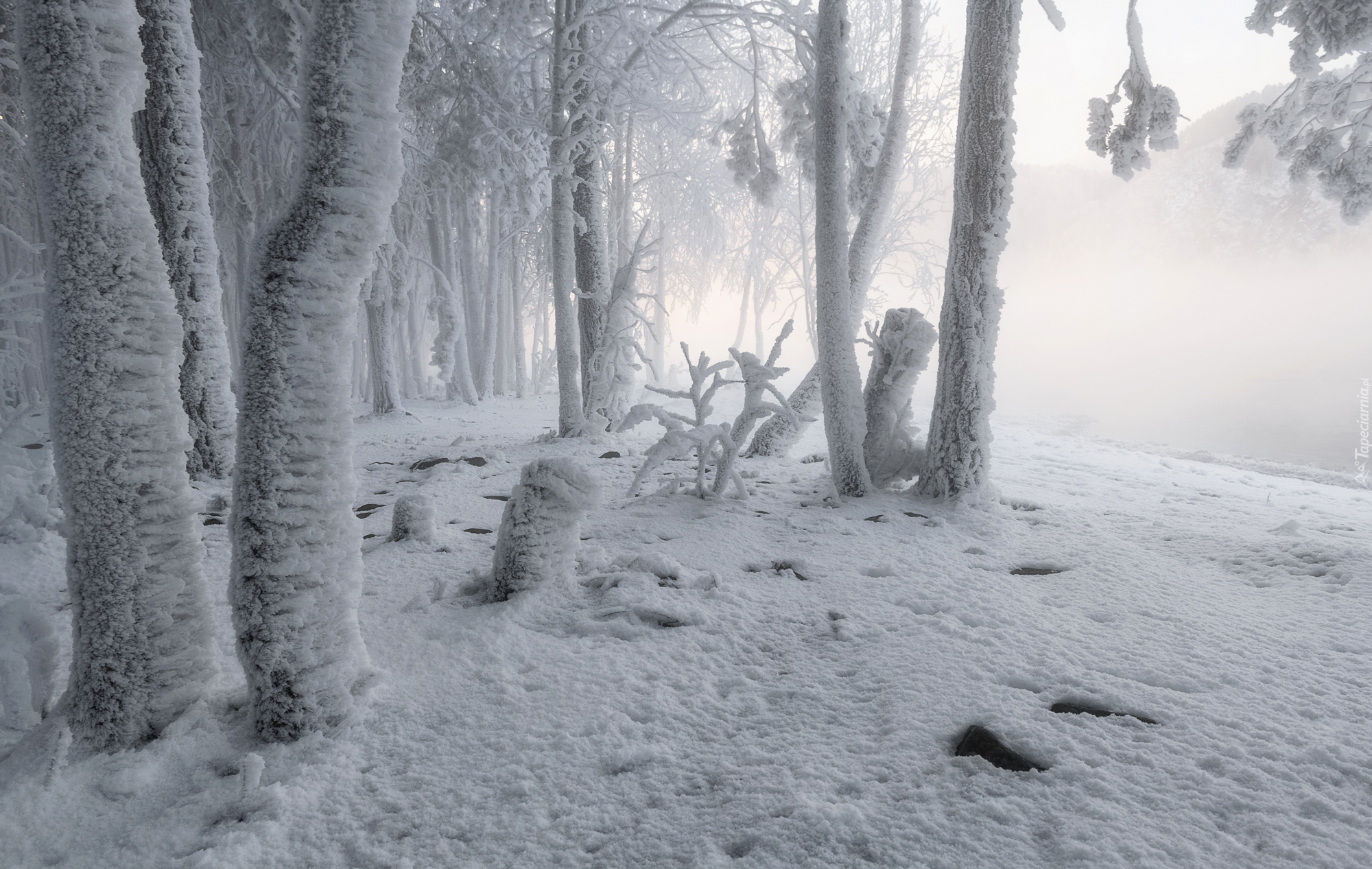 Edytor tapety: Oszronione drzewa w zimowym zamglonym lesie