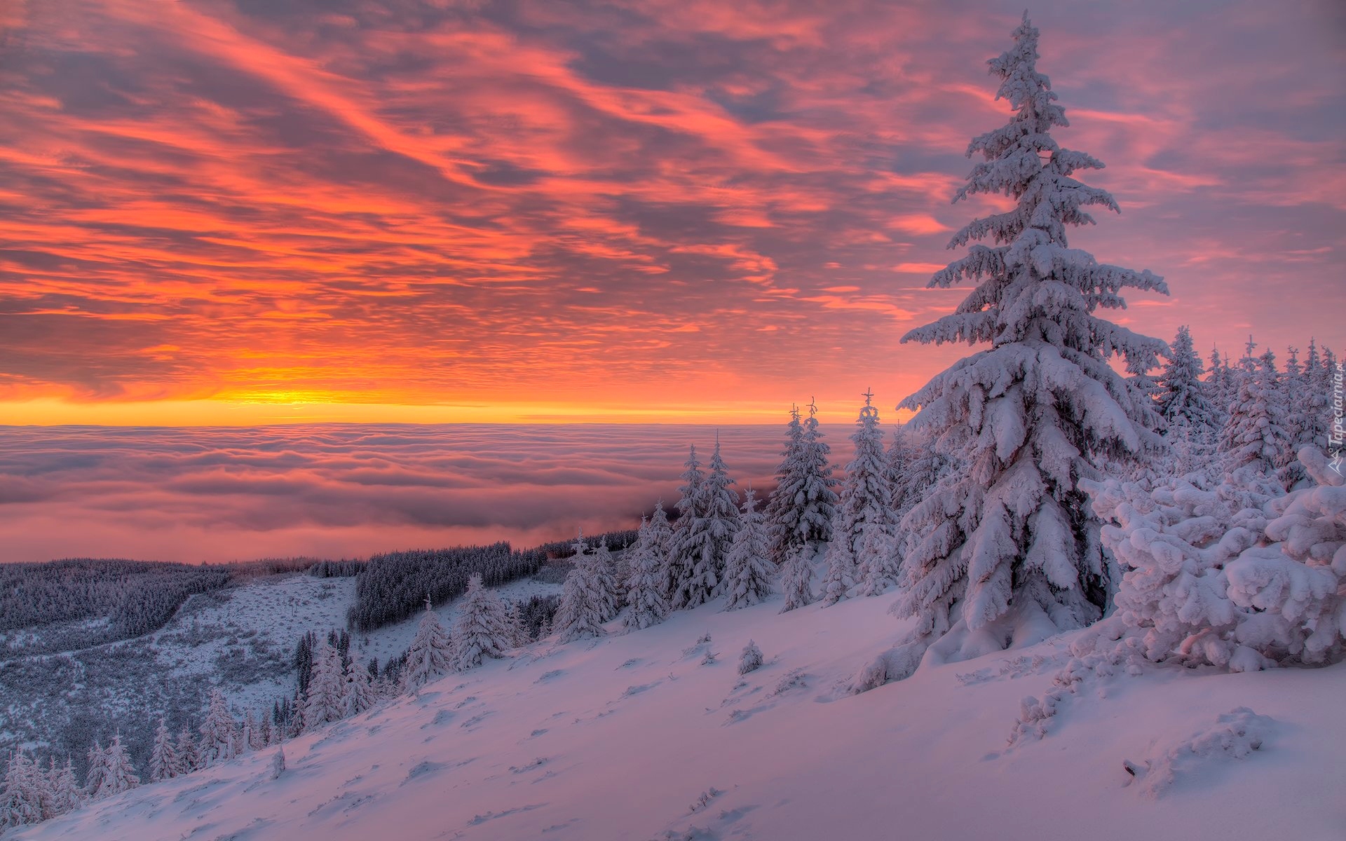 Edytor tapety: Kolorowy wschód słońca nad ośnieżonymi świerkami na wzgórzu