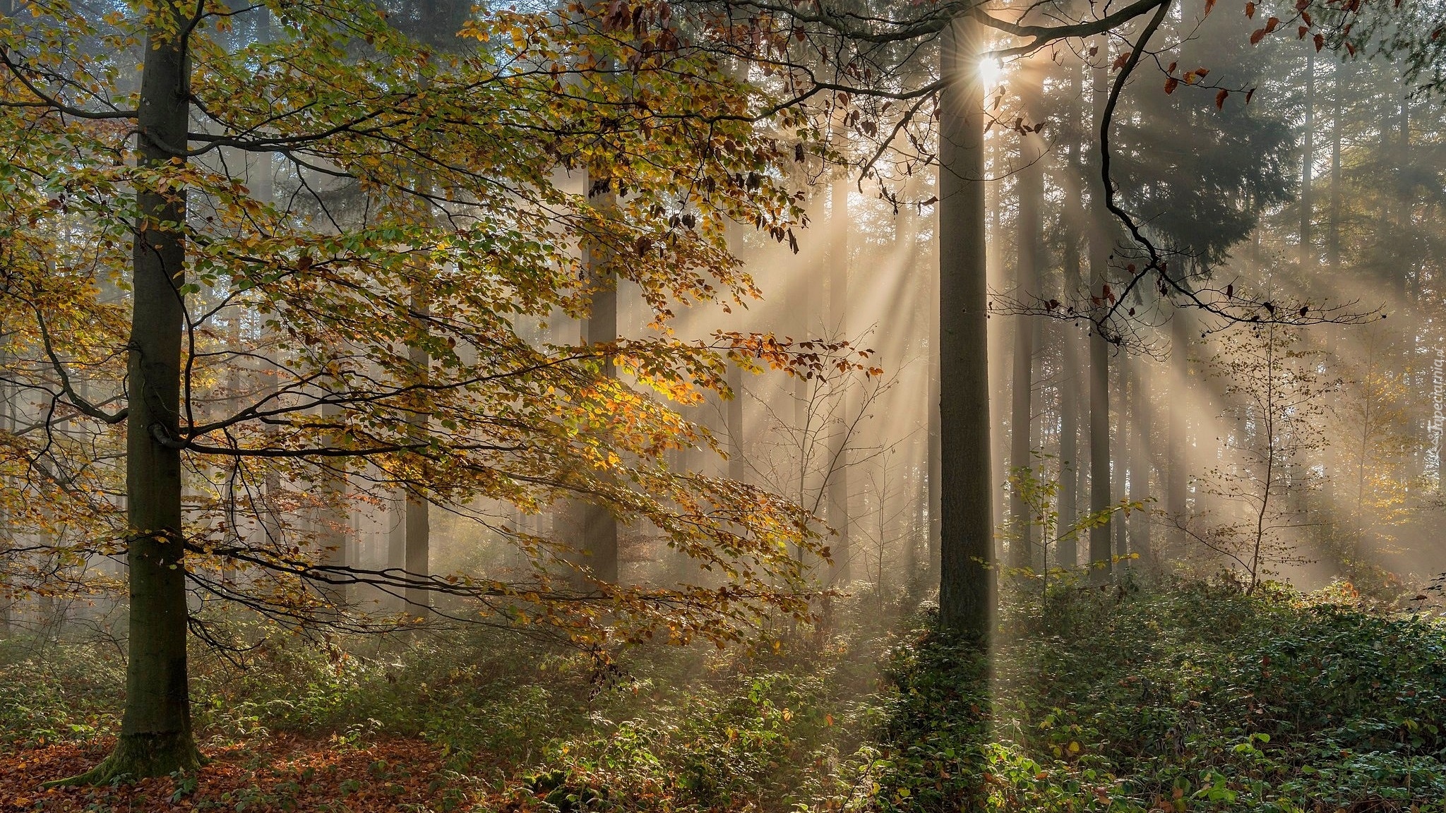 Edytor tapety: Jesienny las oświetlony promieniami słońca