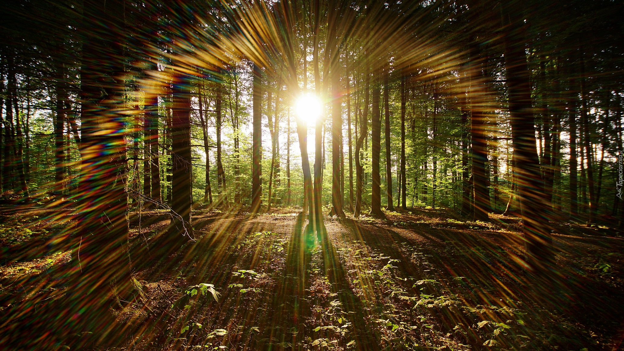 Edytor tapety: Słoneczne refleksy wśród drzew w lesie