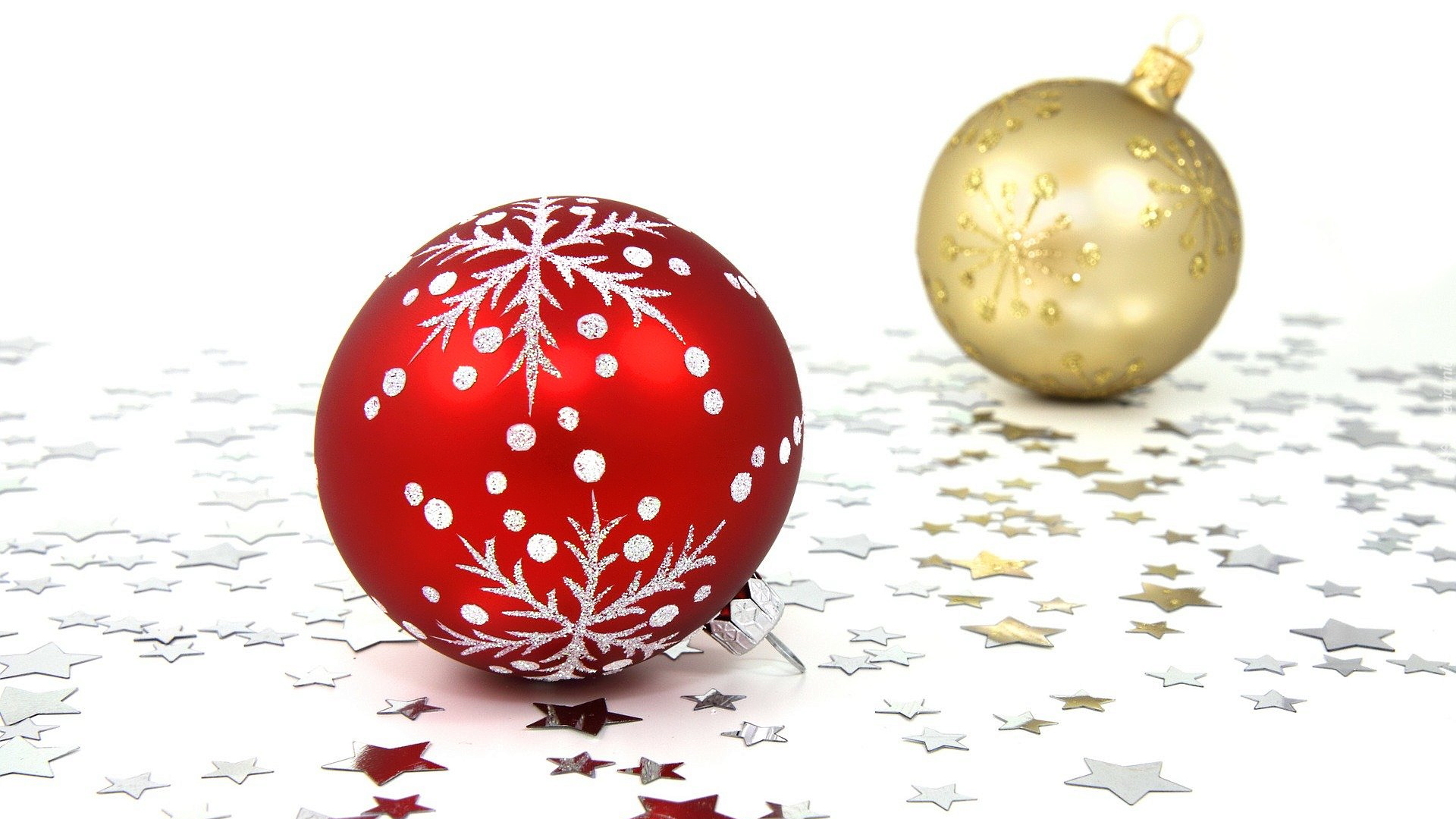 Edytor tapety: Czerwona i złota bombka na srebrnych gwiazdkach