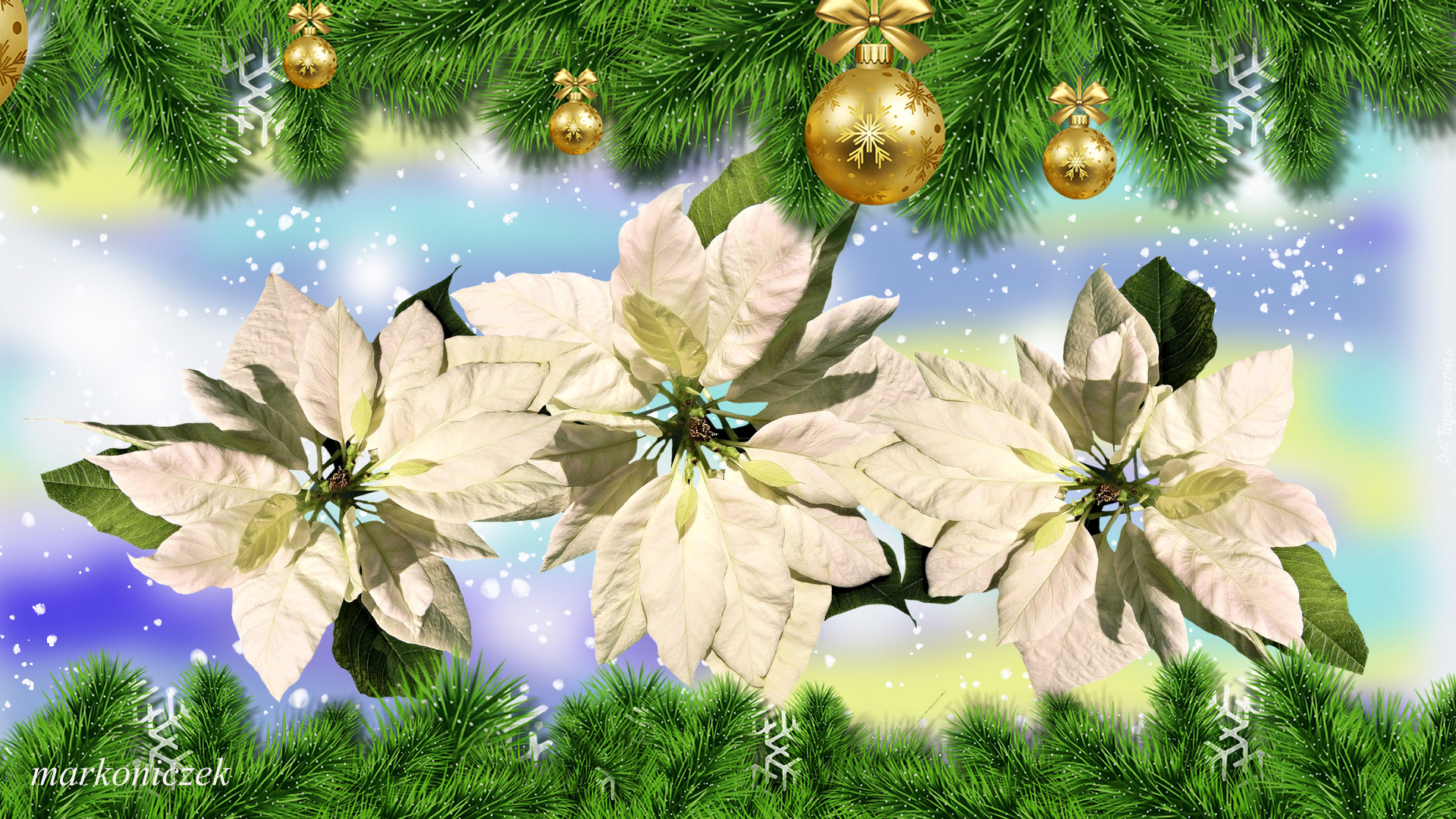 Edytor tapety: Białe gwiazdy betlejemskie pomiędzy świerkowymi gałązkami