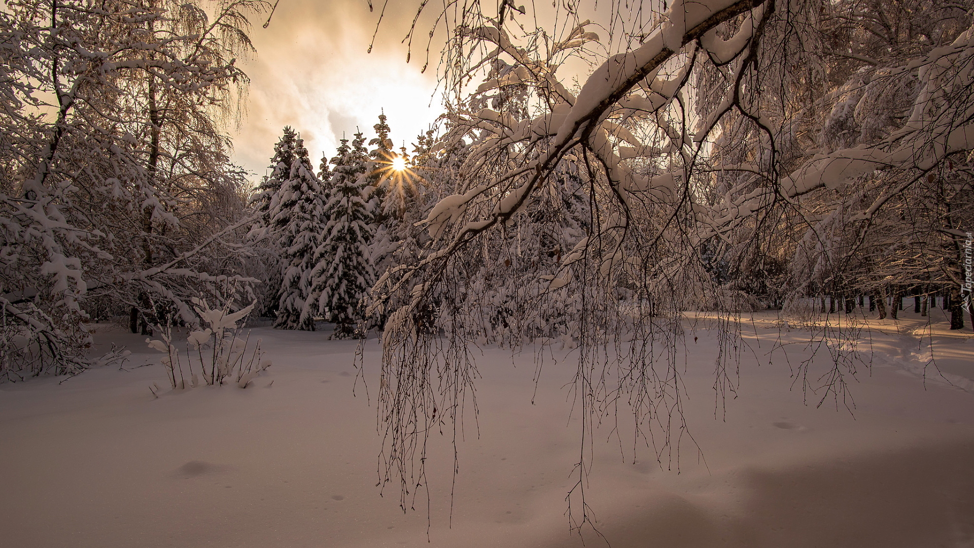 Edytor tapety: Ośnieżone gałęzie i drzewa w porannym słońcu