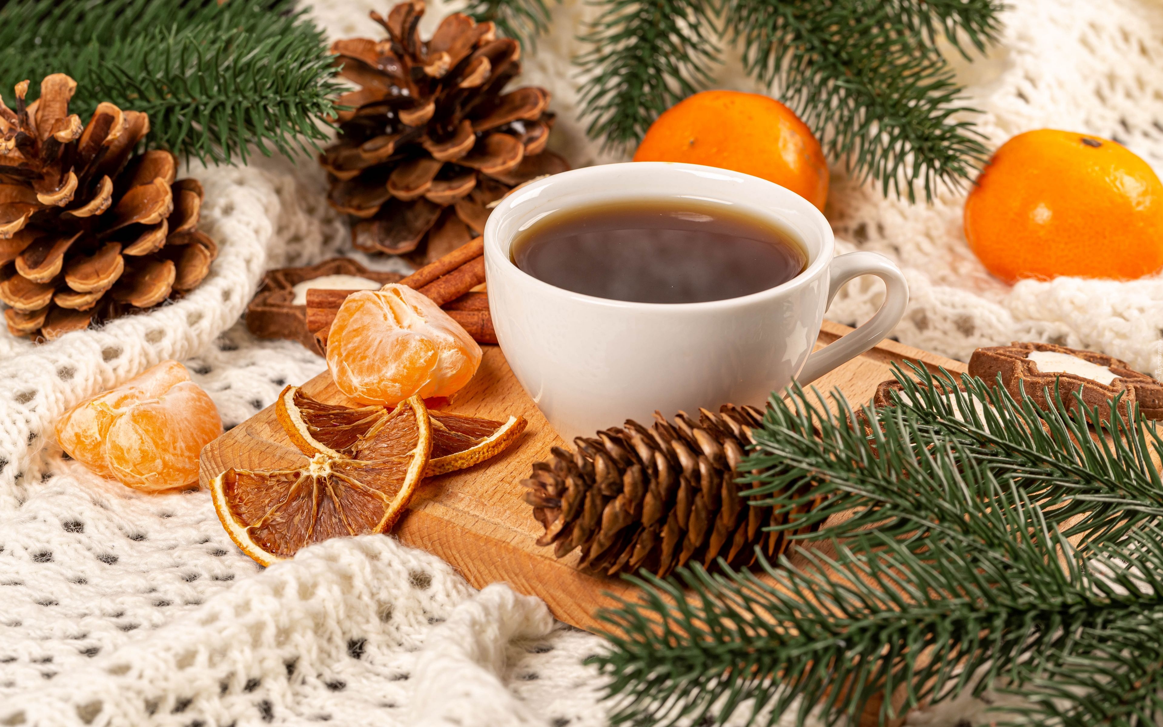 Edytor tapety: Filiżanka kawy obok szyszek i gałązek