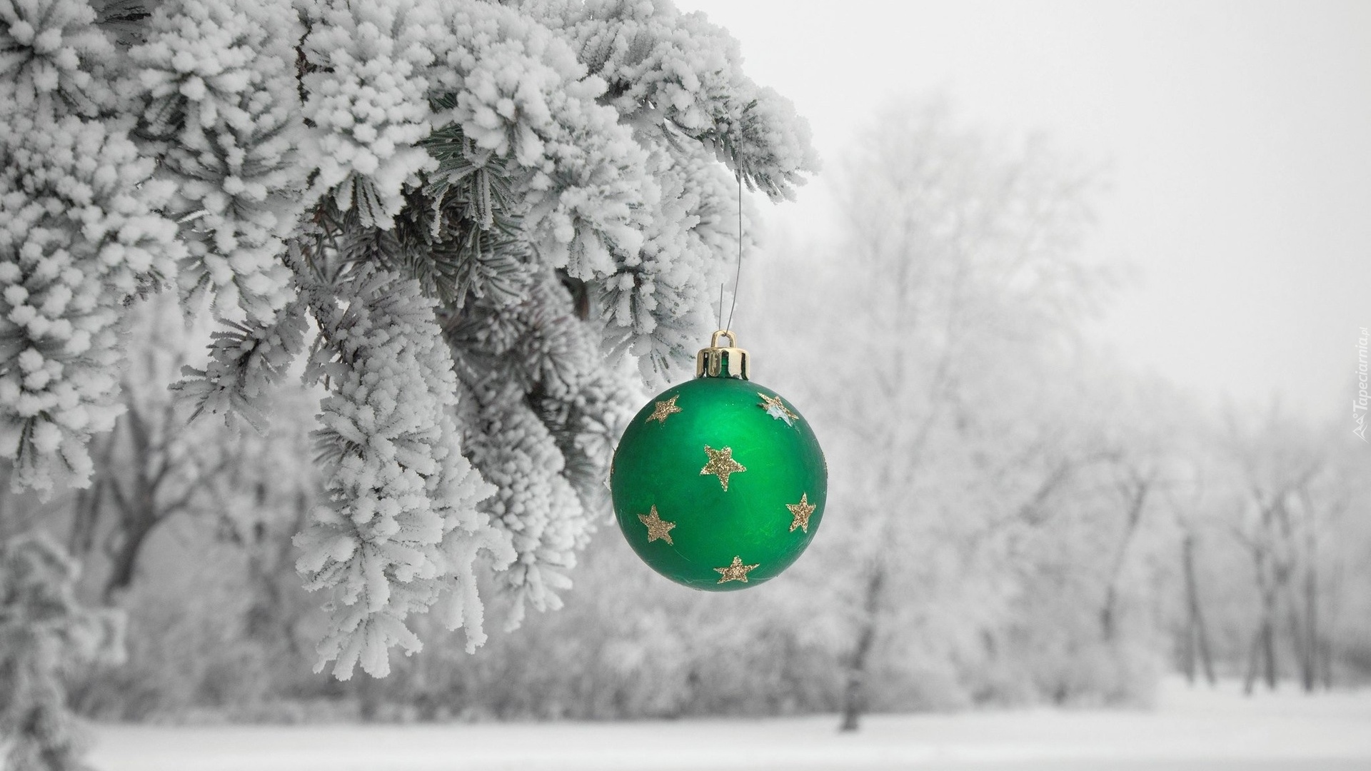 Edytor tapety: Zielona bombka w gwiazdki na oszronionej gałązce