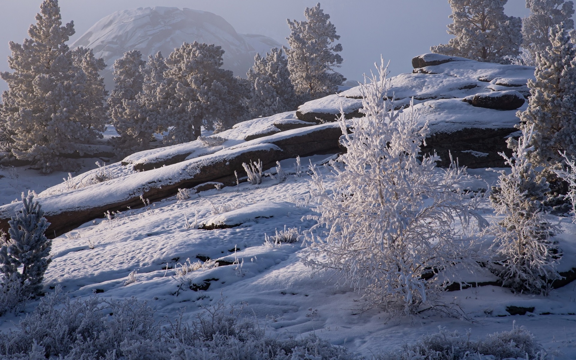 Edytor tapety: Śnieg na skałach i drzewach w blasku słońca