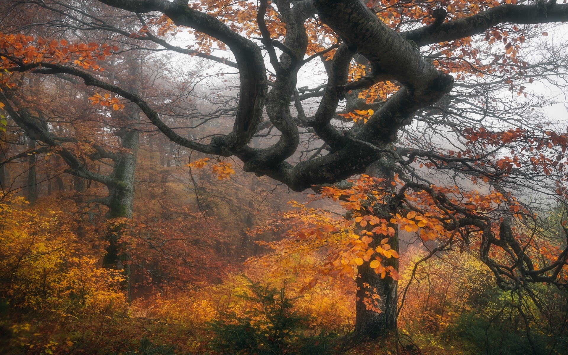 Edytor tapety: Drzewo z rozłożystymi konarami w jesiennym lesie