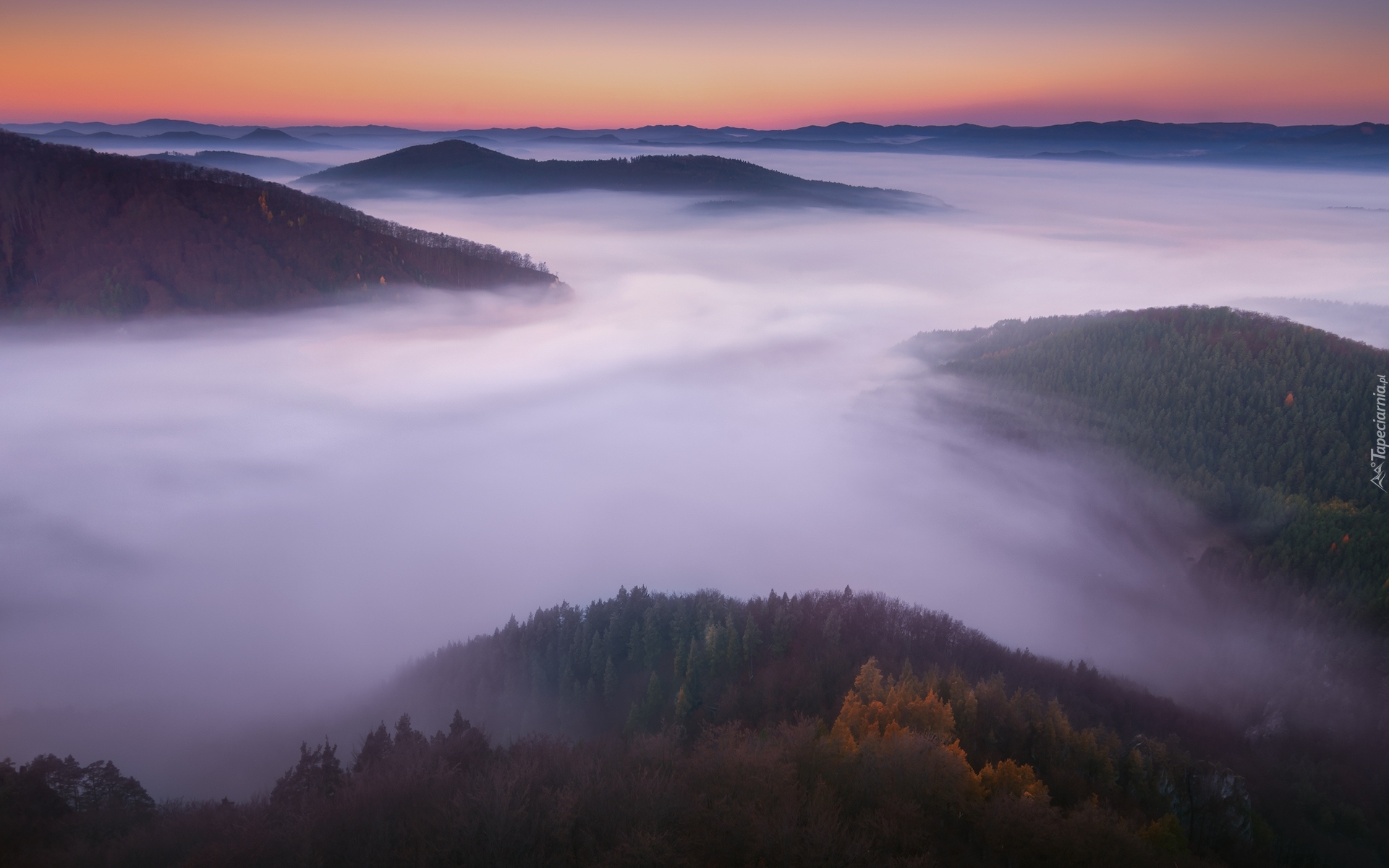 Edytor tapety: Zalesione szczyty gór we mgle