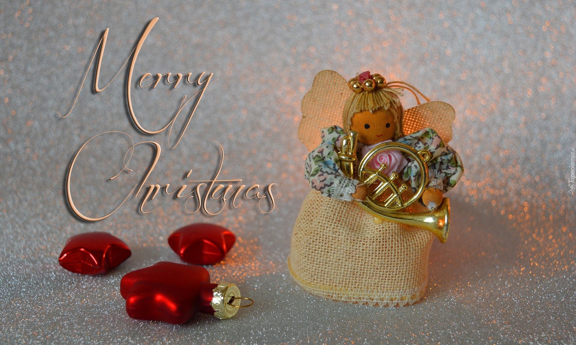 Edytor tapety: Szmaciany aniołek z trąbką obok życzeń i bombek