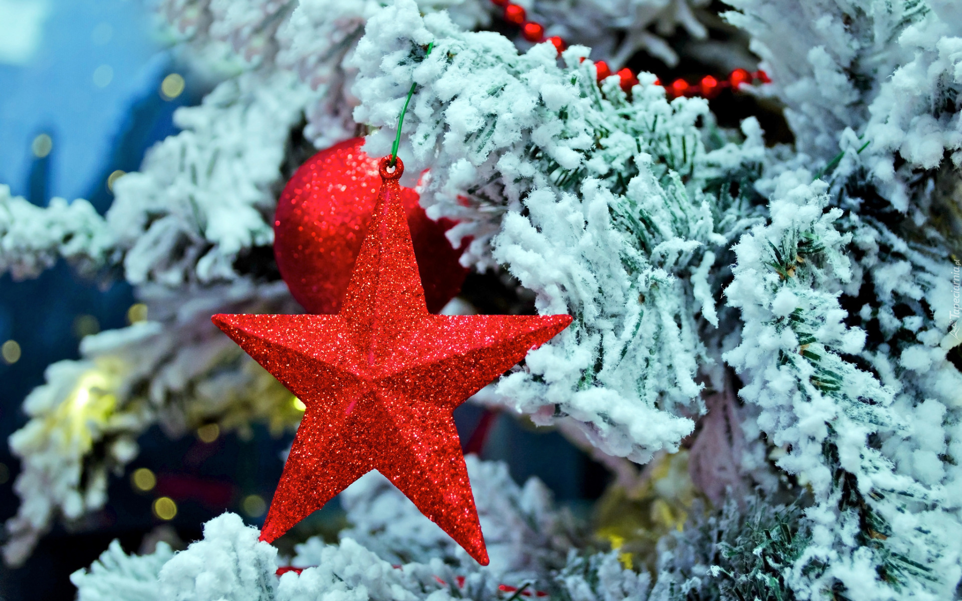 Edytor tapety: Czerwona gwiazdka i bombka na ośnieżonych gałązkach