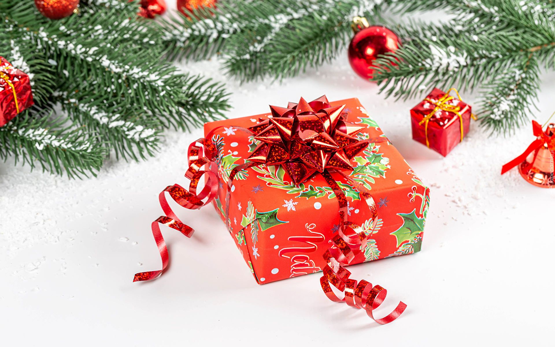 Edytor tapety: Prezenty obok ośnieżonych gałązek i bombek