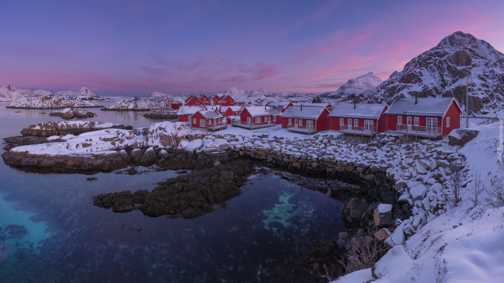 Edytor tapety: Czerwone domki na Lofotach zimową porą
