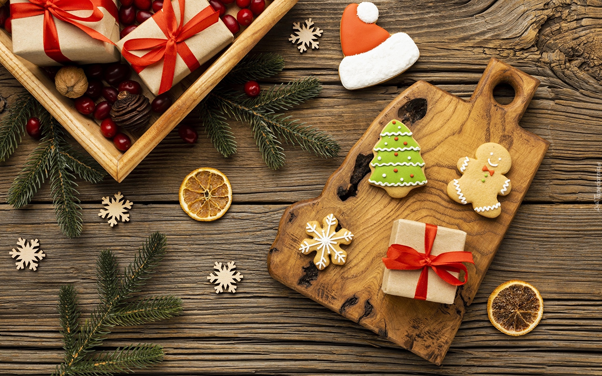 Edytor tapety: Pierniczki na desce i prezenty na tacy