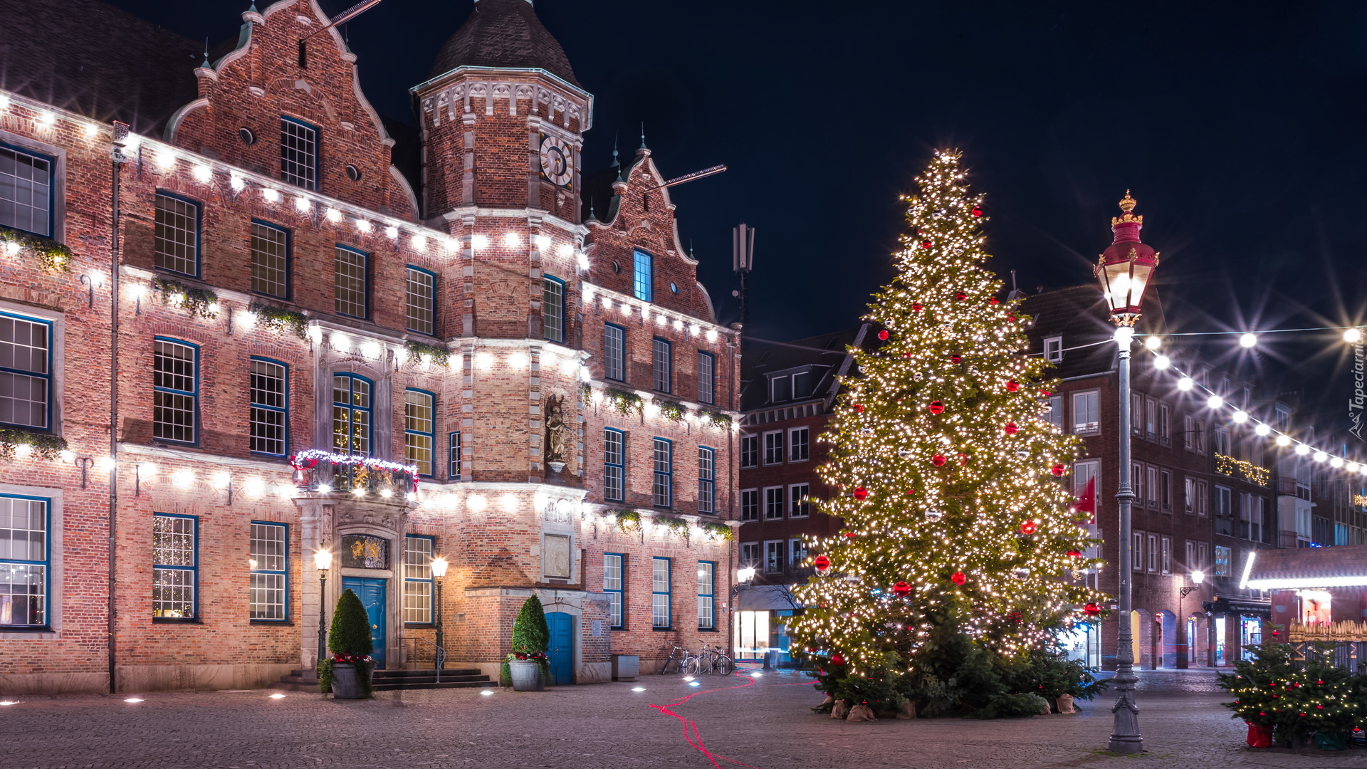 Edytor tapety: Oświetlona choinka przed ratuszem w Dusseldorfie nocą