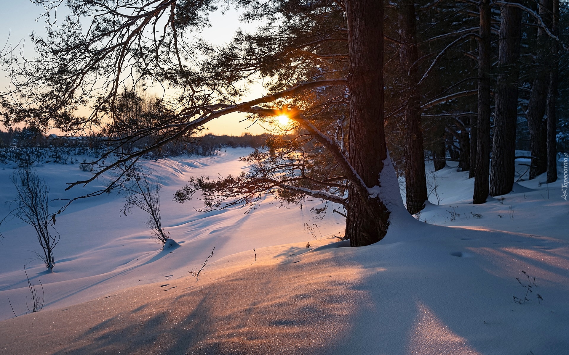 Edytor tapety: Drzewa w śniegu oświetlone porannym słońcem
