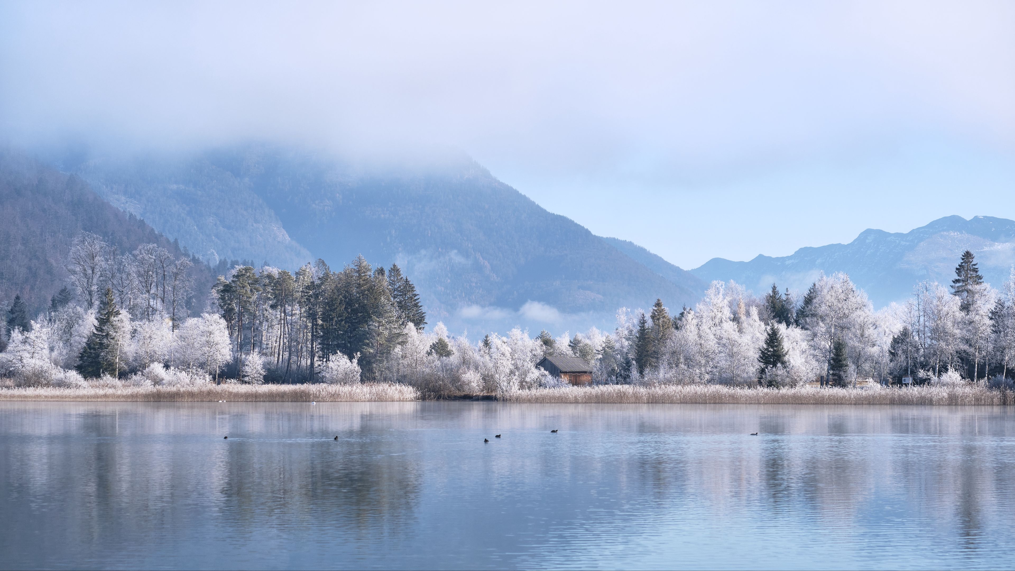 Edytor tapety: Dom wśród ośnieżonych drzew nad jeziorem
