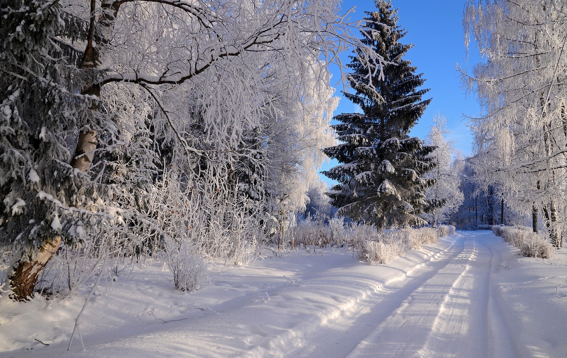 Edytor tapety: Droga obok drzew w zimowym lesie