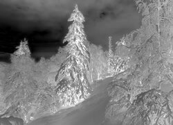 Edytor tapety: Ośnieżone drzewa na wzgórzu na tle wschodzącego słońca