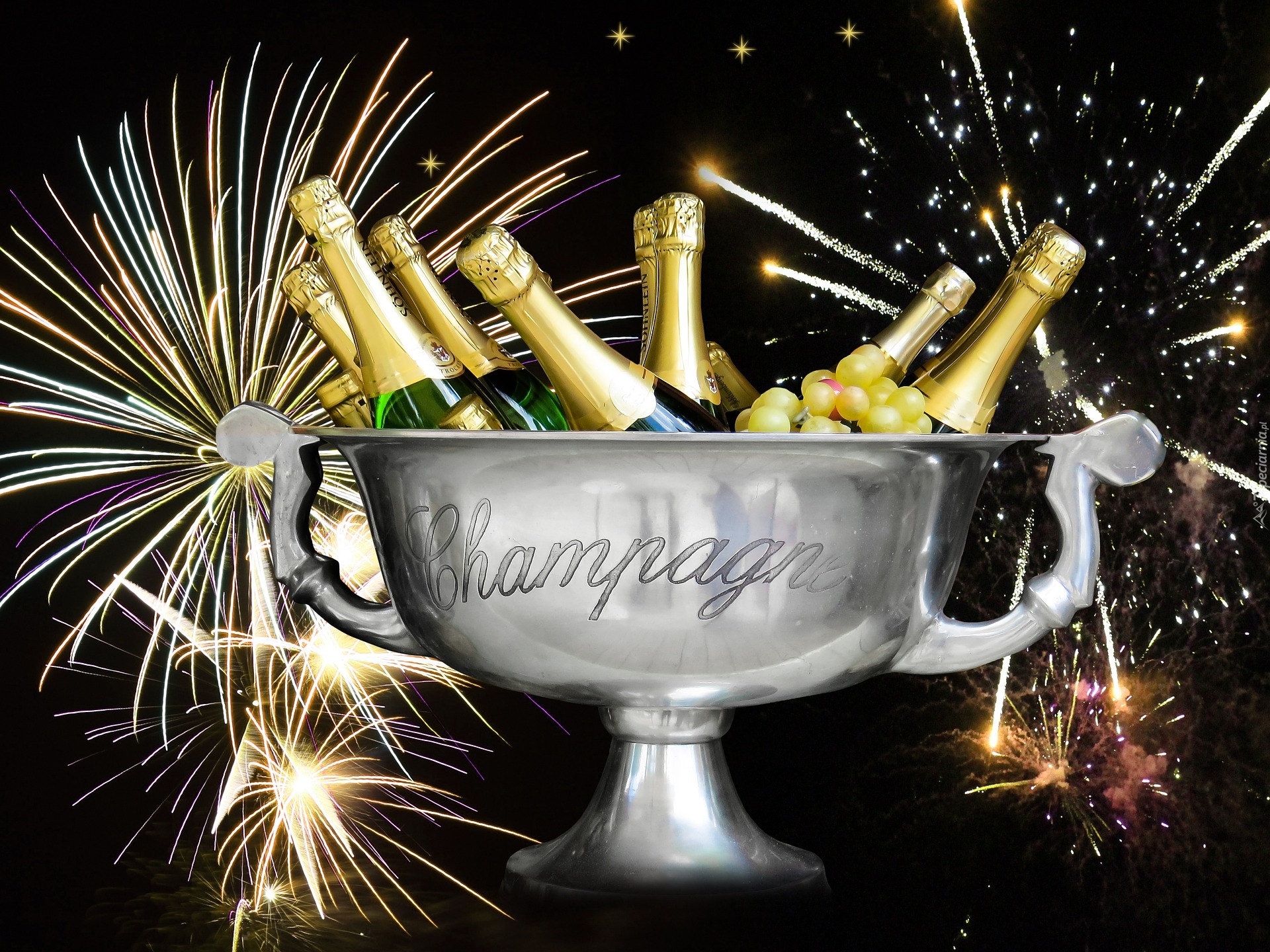 Edytor tapety: Butelki szampana na tle fajerwerków