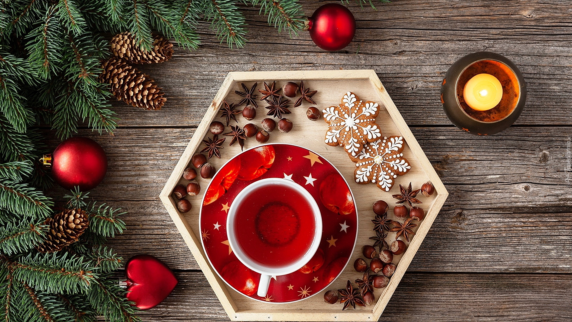 Edytor tapety: Filiżanka herbaty obok gałązek i bombek