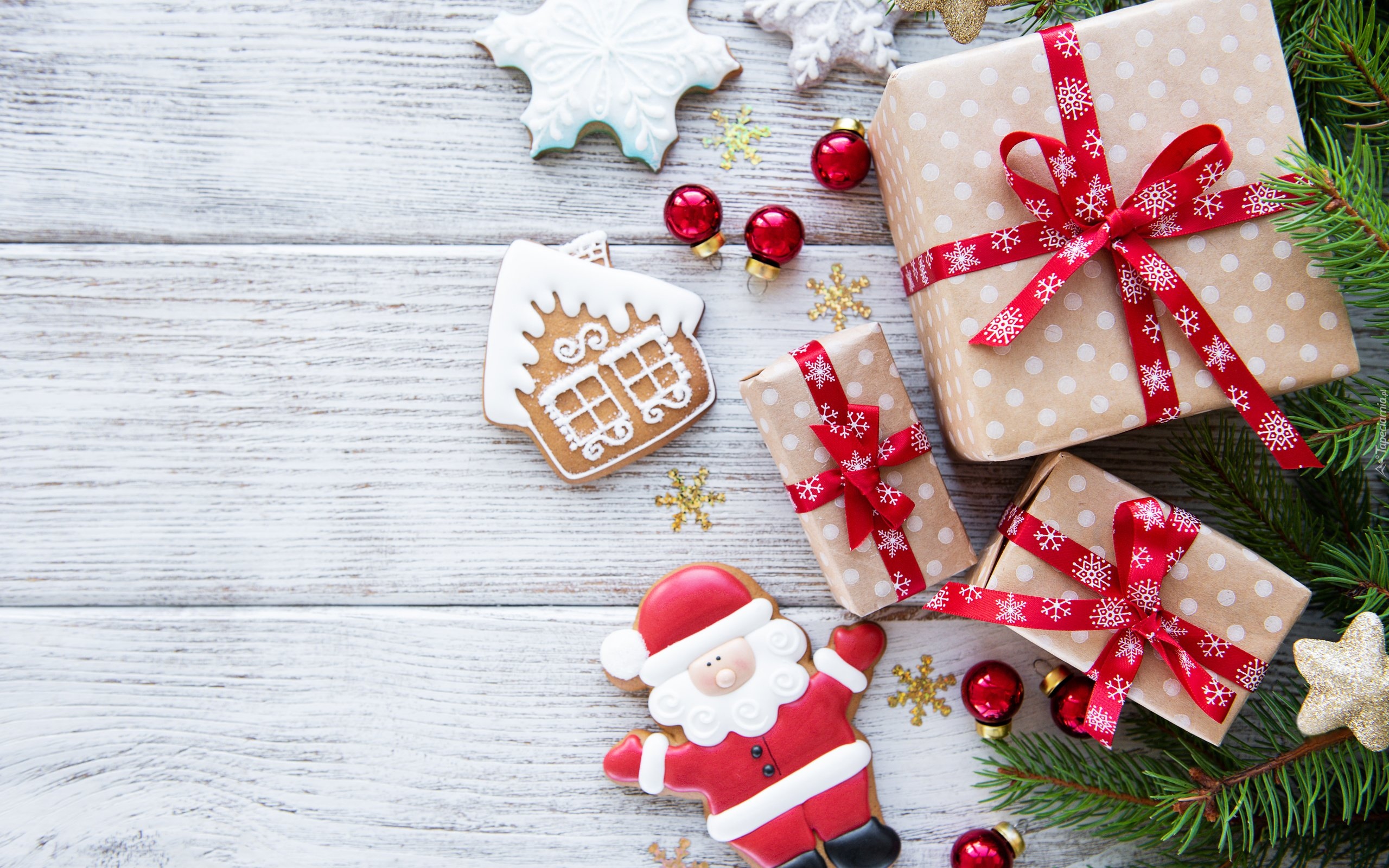Edytor tapety: Świąteczne pierniczki obok prezentów i gałązek na deskach