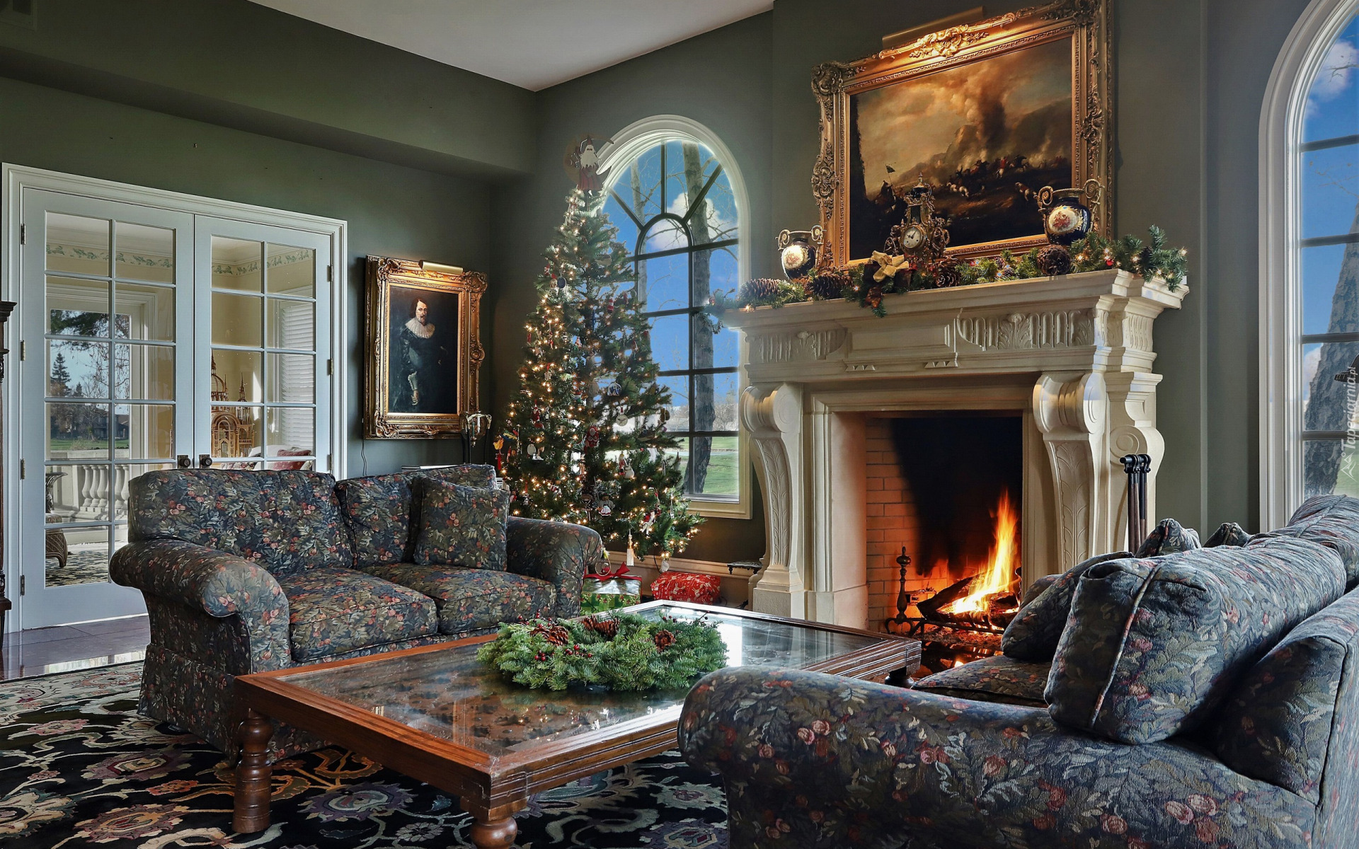 Edytor tapety: Choinka przy oknie i płonący kominek w salonie
